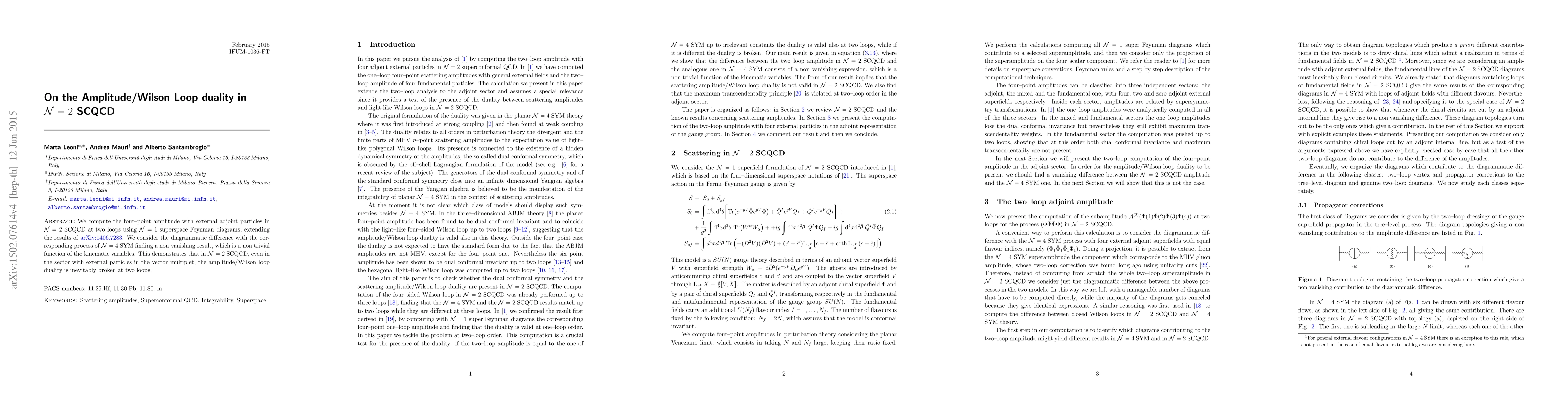 We compute the four-point amplitude with external adjoint particles in $\mathcal{N}=2$ SCQCD at two loops using $\mathcal{N}=1$ superspace Feynman diagrams, extending the results of arXiv:1406.7283. We consider the diagrammatic difference with the corresponding process of $\mathcal{N}=4$ SYM finding a non vanishing result, which is a non trivial function of the kinematic variables. This demonstrates that in $\mathcal{N}=2$ SCQCD, even in the sector with external particles in the vector multiplet, the amplitude/Wilson loop duality is inevitably broken at two loops.