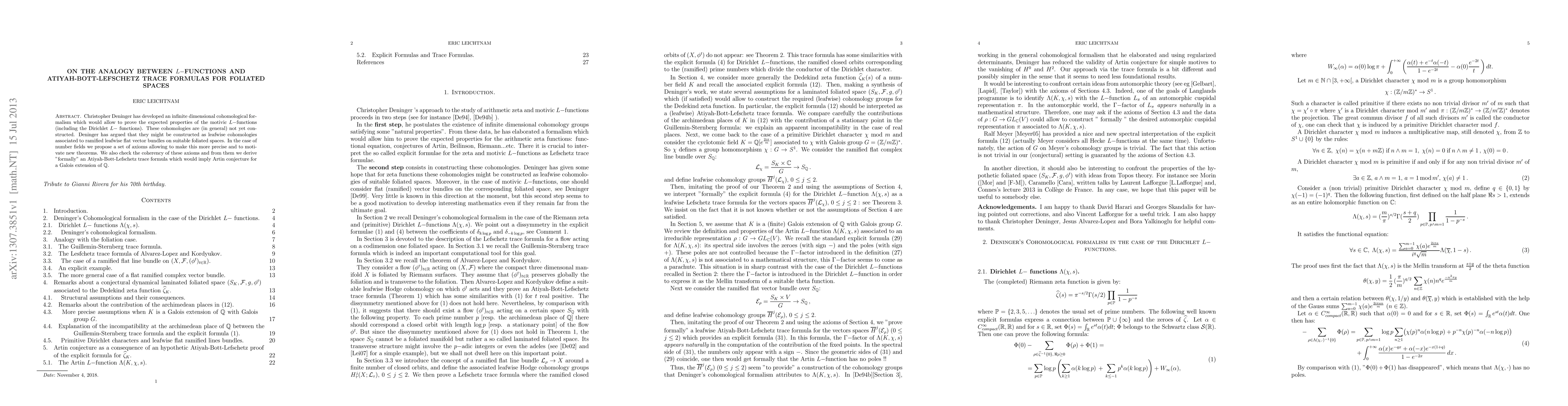 This paper is motivated by Deninger's programme. First we prove, using Alvarez Lopez-Kordyukov results, an Atiyah-Bott-Lefschetz trace formula for the cohomology groups associated to a ramified leafwise flat line bundle on a riemannian foliation. Then we argue, by precise computations, that cohomology groups associated to ramified leafwise flat vector bundles on a suitable foliated space (whose existence is still unknown) might be useful to study arithmetic L-functions via Atiyah-Bott-Lefschetz trace formulas.