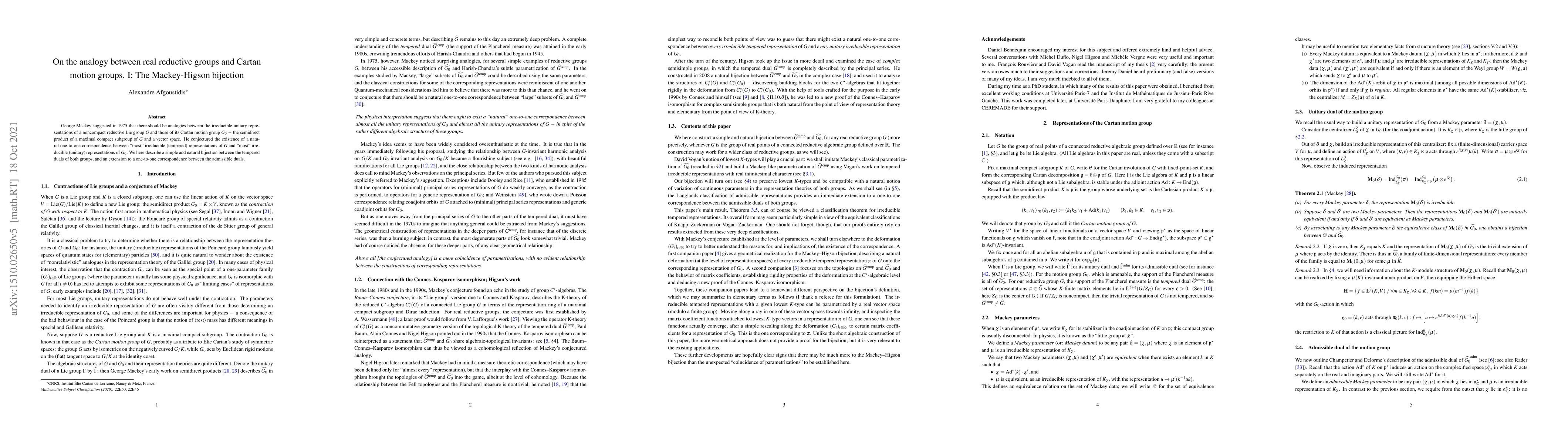 George Mackey suggested in 1975 that there should be analogies between the irreducible unitary representations of a noncompact reductive Lie group $G$ and those of its Cartan motion group $G_0$ $-$ the semidirect product of a maximal compact subgroup of $G$ and a vector space. He conjectured the existence of a natural one-to-one correspondence between "most" irreducible (tempered) representations of $G$ and "most" irreducible (unitary) representations of $G_0$. We here describe a simple and natural bijection between the tempered duals of both groups, and an extension to a one-to-one correspondence between the admissible duals.