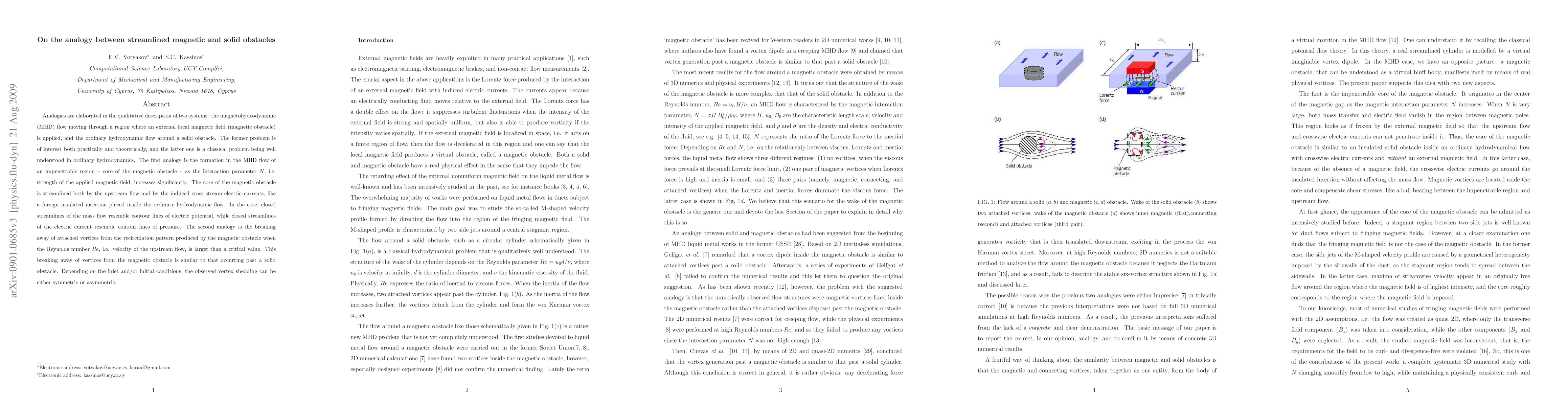 This paper draws parallels between magnetohydrodynamic (MHD) flow around a magnetic obstacle and ordinary fluid flow around a solid obstacle. It highlights that the magnetic obstacle's core, formed by increasing magnetic field strength, behaves similarly to a foreign insulated insertion in fluid flow, being streamlined by upstream flow and induced electric currents. The study also reveals that vortices breaking away from the magnetic obstacle mirror those around a solid obstacle, with symmetry depending on inlet/initial conditions.
