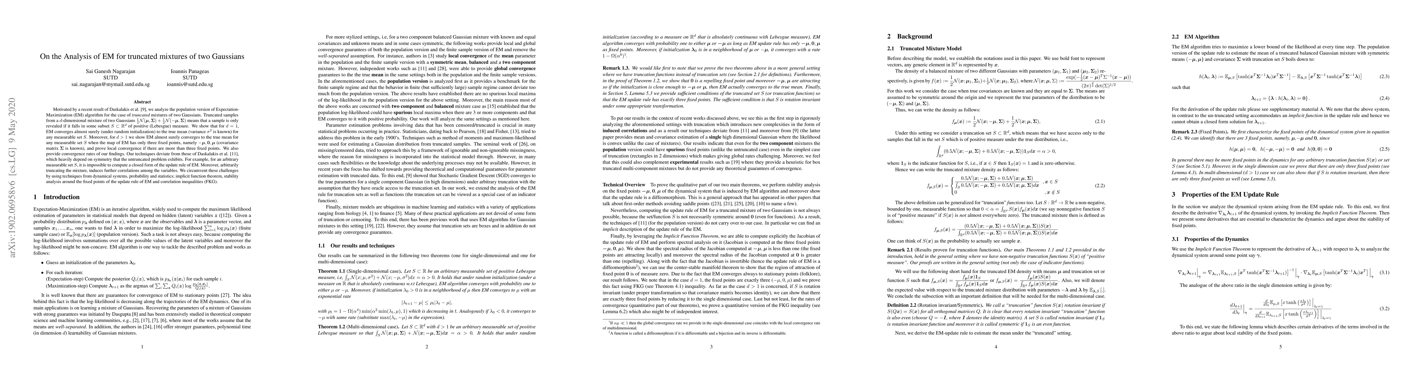 Motivated by a recent result of Daskalakis et al. 2018, we analyze the population version of Expectation-Maximization (EM) algorithm for the case of \textit{truncated} mixtures of two Gaussians. Truncated samples from a $d$-dimensional mixture of two Gaussians $\frac{1}{2} \mathcal{N}(\vec{\mu}, \vec{\Sigma})+ \frac{1}{2} \mathcal{N}(-\vec{\mu}, \vec{\Sigma})$ means that a sample is only revealed if it falls in some subset $S \subset \mathbb{R}^d$ of positive (Lebesgue) measure. We show that for $d=1$, EM converges almost surely (under random initialization) to the true mean (variance $\sigma^2$ is known) for any measurable set $S$. Moreover, for $d>1$ we show EM almost surely converges to the true mean for any measurable set $S$ when the map of EM has only three fixed points, namely $-\vec{\mu}, \vec{0}, \vec{\mu}$ (covariance matrix $\vec{\Sigma}$ is known), and prove local convergence if there are more than three fixed points. We also provide convergence rates of our findings. Our techniques deviate from those of Daskalakis et al. 2017, which heavily depend on symmetry that the untruncated problem exhibits. For example, for an arbitrary measurable set $S$, it is impossible to compute a closed form of the update rule of EM. Moreover, arbitrarily truncating the mixture, induces further correlations among the variables. We circumvent these challenges by using techniques from dynamical systems, probability and statistics; implicit function theorem, stability analysis around the fixed points of the update rule of EM and correlation inequalities (FKG).