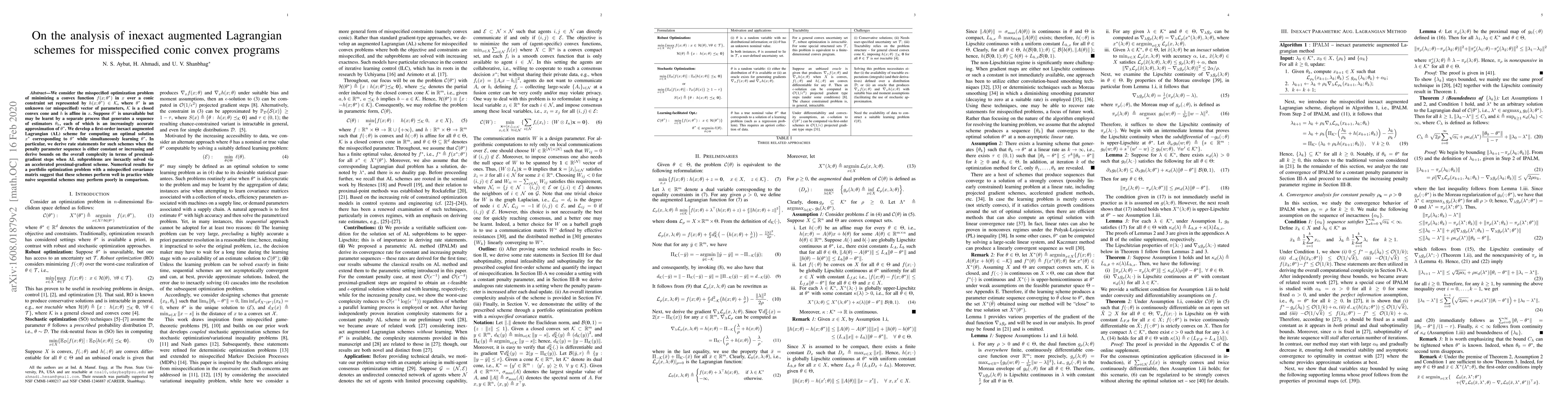 This paper develops an inexact augmented Lagrangian scheme for solving misspecified conic convex programs, where the true parameter is unknown but can be estimated. It provides theoretical convergence rates and complexity bounds for the scheme and demonstrates its effectiveness through numerical experiments on portfolio optimization.