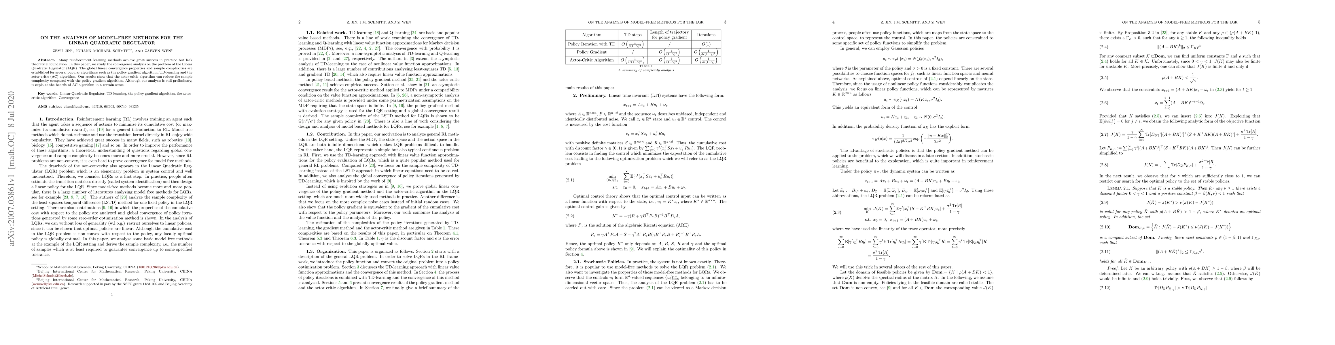 This paper analyzes the convergence properties of model-free reinforcement learning methods for solving the Linear Quadratic Regulator problem. It establishes global linear convergence and sample complexities for algorithms like policy gradient, TD-learning, and actor-critic, showing that the actor-critic algorithm can reduce sample complexity compared to policy gradient.