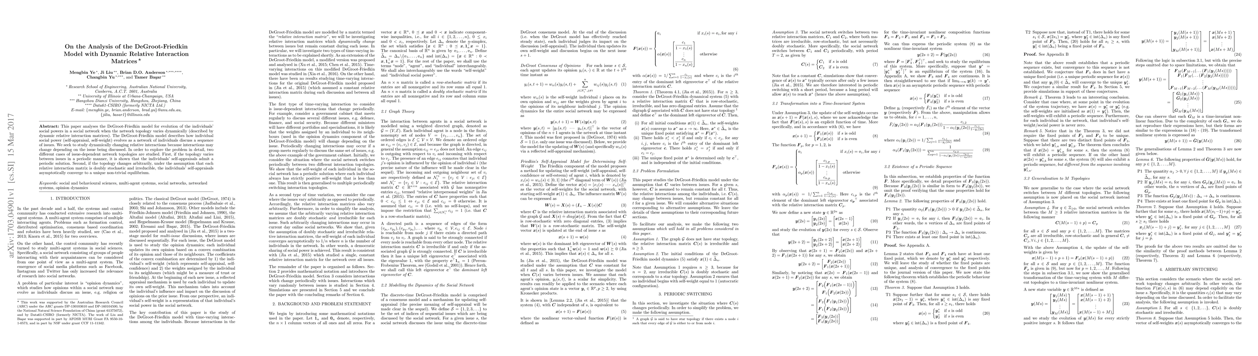The DeGroot-Friedkin model's social power evolution is analyzed under dynamic relative interaction matrices, showing periodic solutions for issue-dependent network topologies and asymptotic convergence to equilibrium for arbitrary topology changes.