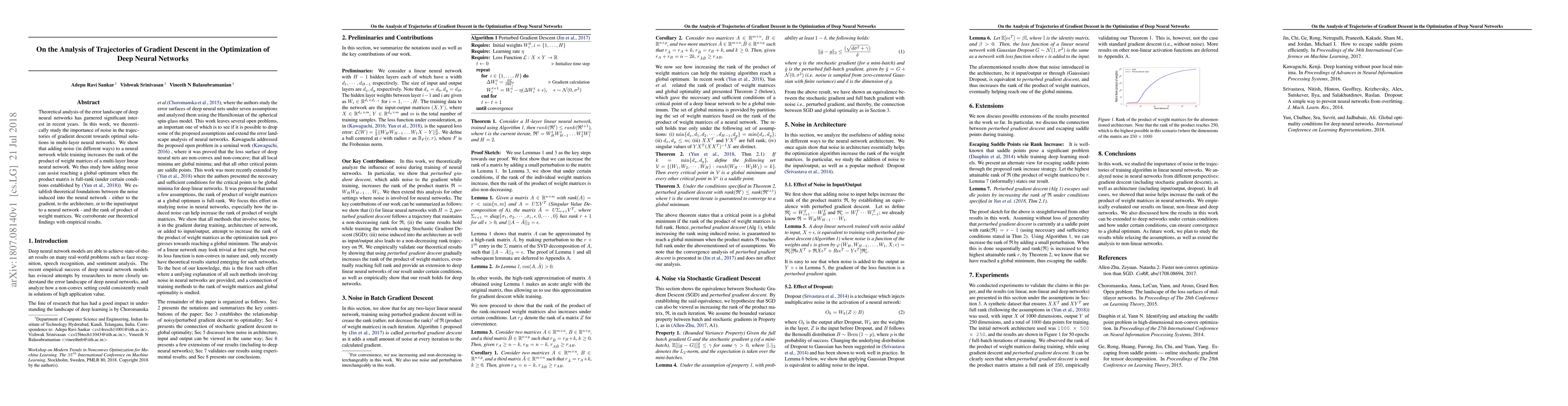 Theoretical analysis of the error landscape of deep neural networks has garnered significant interest in recent years. In this work, we theoretically study the importance of noise in the trajectories of gradient descent towards optimal solutions in multi-layer neural networks. We show that adding noise (in different ways) to a neural network while training increases the rank of the product of weight matrices of a multi-layer linear neural network. We thus study how adding noise can assist reaching a global optimum when the product matrix is full-rank (under certain conditions). We establish theoretical foundations between the noise induced into the neural network - either to the gradient, to the architecture, or to the input/output to a neural network - and the rank of product of weight matrices. We corroborate our theoretical findings with empirical results.