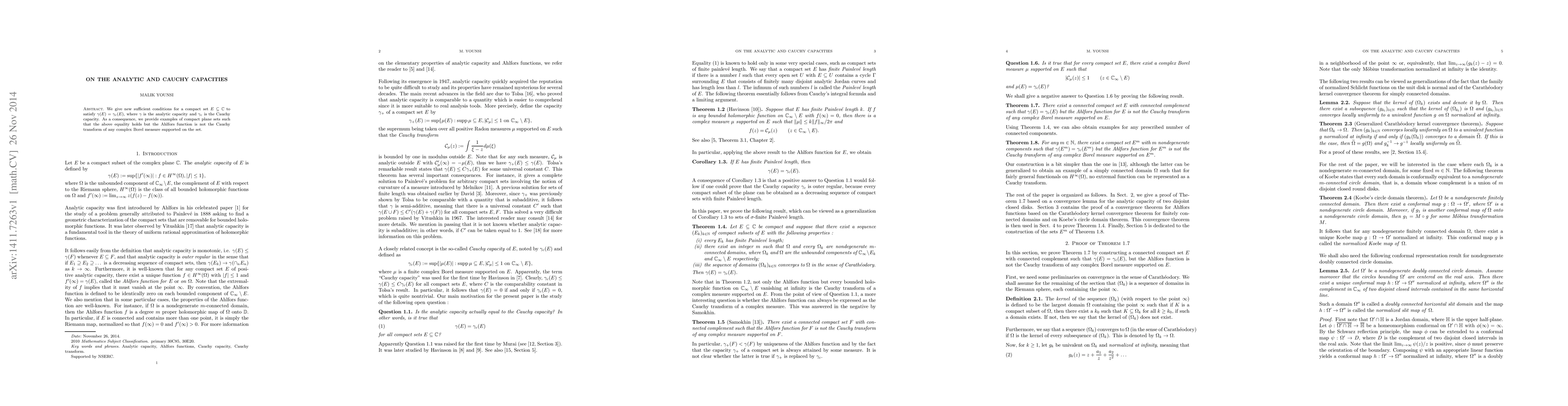 Researchers found new conditions for compact sets in the complex plane to have equal analytic and Cauchy capacities, with implications for understanding these measures.