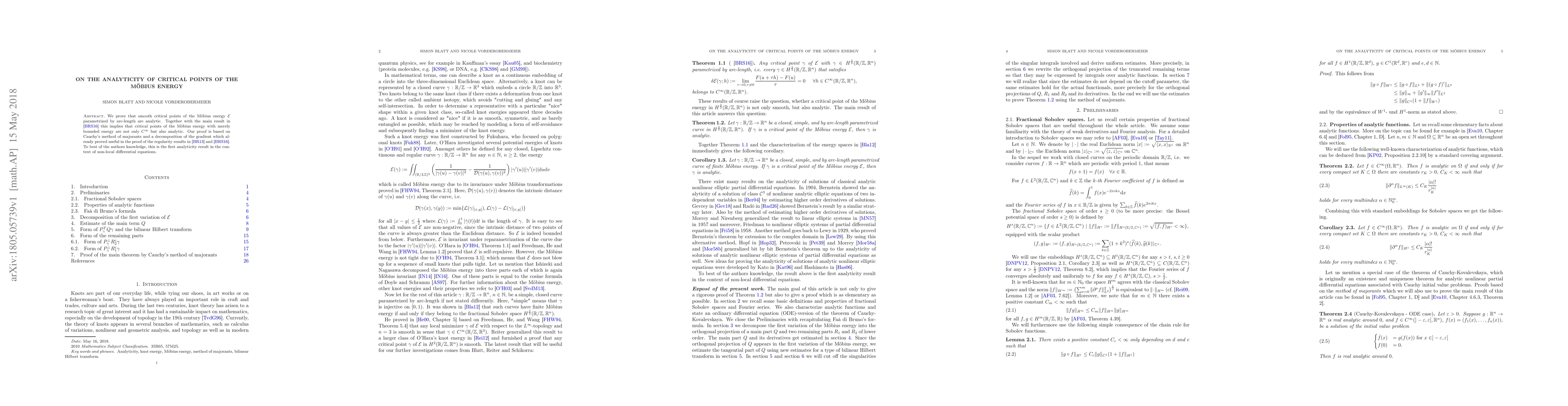 We prove that smooth critical points of the M\"obius energy parametrized by arc-length are analytic. Together with the main result in \cite{BRS16} this implies that critical points of the M\"obius energy with merely bounded energy are not only $C^\infty$ but also analytic. Our proof is based on Cauchy's method of majorants and a decomposition of the gradient which already proved useful in the proof of the regularity results in \cite{BR13} and \cite{BRS16}. To best of the authors knowledge, this is the first analyticity result in the context of non-local differential equations.