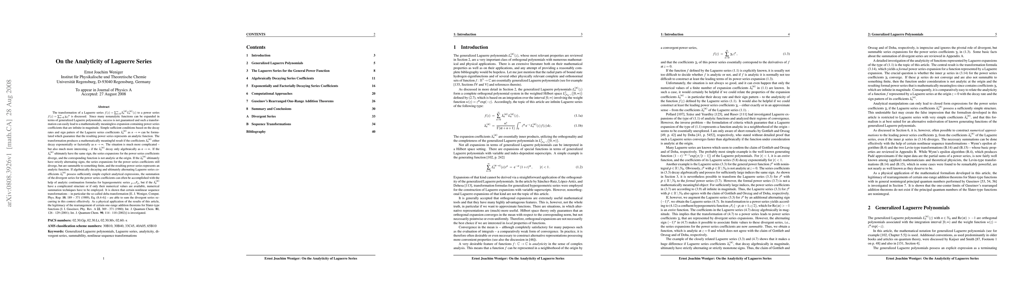 The transformation of a Laguerre series $f (z) = \sum_{n=0}^{\infty} \lambda_{n}^{(\alpha)} L_{n}^{(\alpha)} (z)$ to a power series $f (z) = \sum_{n=0}^{\infty} \gamma_{n} z^{n}$ is discussed. Many nonanalytic functions can be expanded in this way. Thus, success is not guaranteed. Simple sufficient conditions based on the decay rates and sign patters of the $\lambda_{n}^{(\alpha)}$ as $n \to \infty$ can be formulated which guarantee that $f (z$ is analytic at $z=0$. Meaningful result are obtained if the $\lambda_{n}^{(\alpha)}$ either decay exponentially or factorially as $n \to \infty$. The situation is much more complicated if the $\lambda_{n}^{(\alpha)}$ decay algebraically as $n \to \infty$. If the $\lambda_{n}^{(\alpha)}$ ultimately have the same sign, the series expansions for the power series coefficients diverge, and the corresponding function is not analytic at $z=0. If the $\lambda_{n}^{(\alpha)}$ ultimately have strictly alternating signs, the series expansions for the power series coefficients are summable and the power series represents an analytic function. In the case of simple $\lambda_{n}^{(\alpha)}$, the summation of the divergent series for the power series coefficients can often be accomplished with the help of analytic continuation formulas for hypergeometric series, but if the $\lambda_{n}^{(\alpha)}$ are more complicated, numerical techniques have to be employed. Certain nonlinear sequence transformations -- in particular the so-called delta transformation [E. J. Weniger, Comput. Phys. Rep. \textbf{10}, 189 -- 371 (1989), Eq. (8.4-4)] -- sum the divergent series occurring in this context effectively.