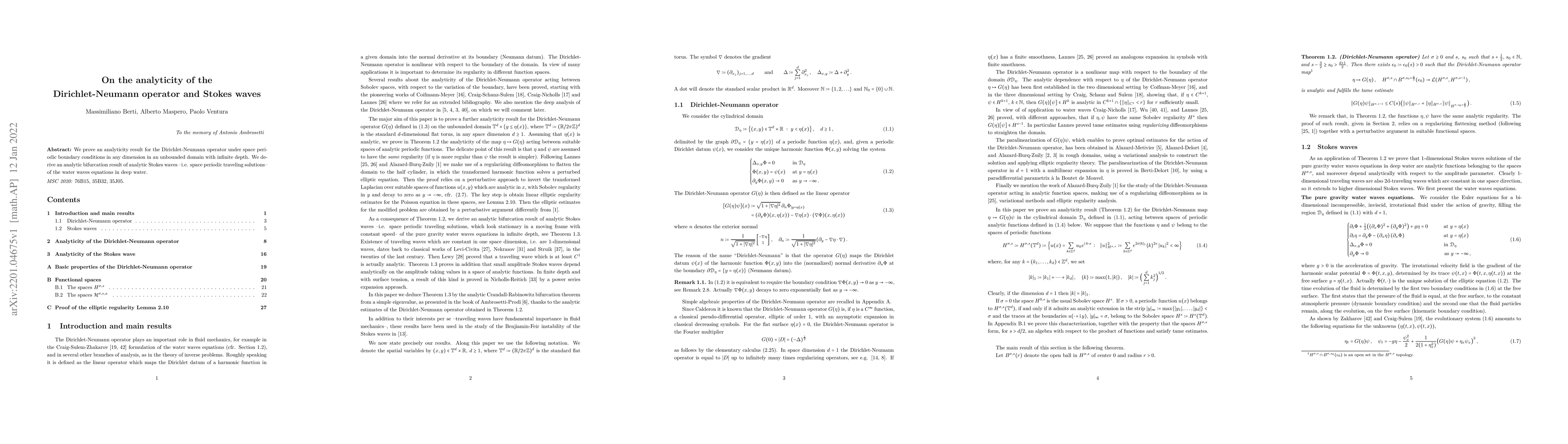 Summary: The paper establishes analyticity for the Dirichlet-Neumann operator under periodic boundary conditions in any dimension and proves an analytic bifurcation result for periodic traveling wave solutions, known as analytic Stokes waves, of the water waves equations in deep water.