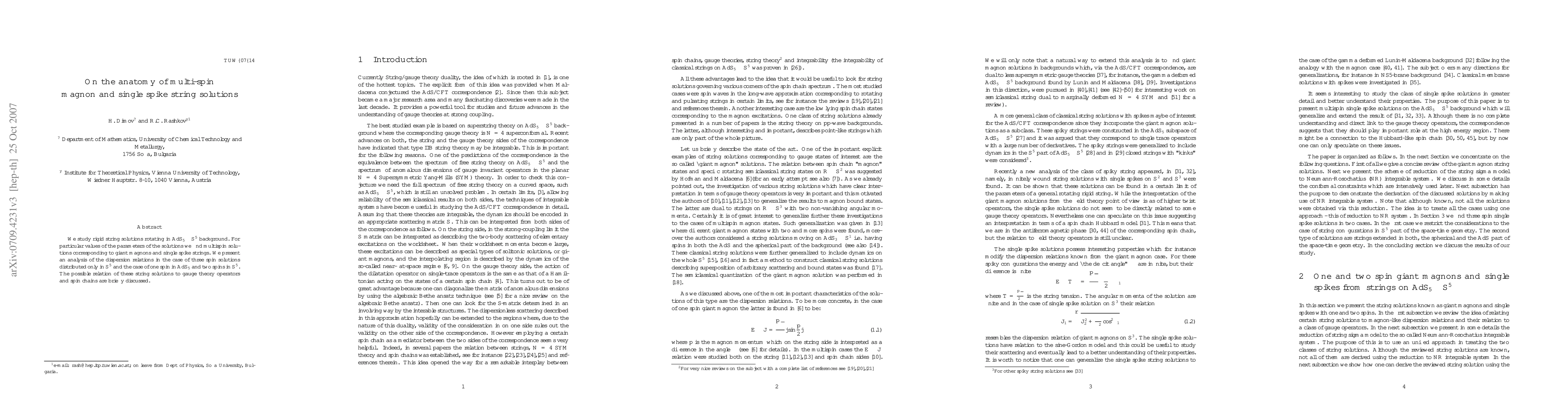 We study rigid string solutions rotating in $AdS_5\times S^5$ background. For particular values of the parameters of the solutions we find multispin solutions corresponding to giant magnons and single spike strings. We present an analysis of the dispersion relations in the case of three spin solutions distributed only in $S^5$ and the case of one spin in $AdS_5$ and two spins in $S^5$. The possible relation of these string solutions to gauge theory operators and spin chains are briefly discussed.