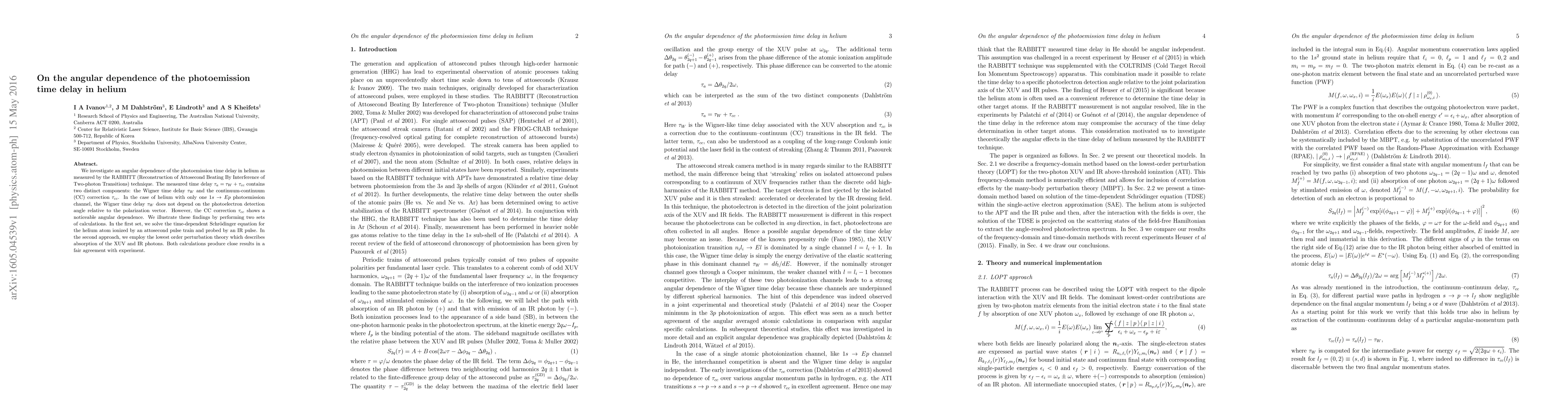 We investigate an angular dependence of the photoemission time delay in helium as measured by the RABBITT (Reconstruction of Attosecond Beating By Interference of Two-photon Transitions) technique. The measured time delay $ \tau_a=\tau_W+\tau_{cc} $ contains two distinct components: the Wigner time delay $\tau_W$ and the continuum-continuum CC) correction $\tau_{cc}$. In the case of helium with only one $1s\to Ep$ photoemission channel, the Wigner time delay $\tau_W$ does not depend on the photoelectron detection angle relative to the polarization vector. However, the CC correction $\tau_{cc}$ shows a noticeable angular dependence. We illustrate these findings by performing two sets of calculations. In the first set, we solve the time-dependent Schr\"odinger equation for the helium atom ionized by an attosecond pulse train and probed by an IR pulse. In the second approach, we employ the lowest order perturbation theory which describes absorption of the XUV and IR photons. Both calculations produce close results in a fair agreement with experiment.