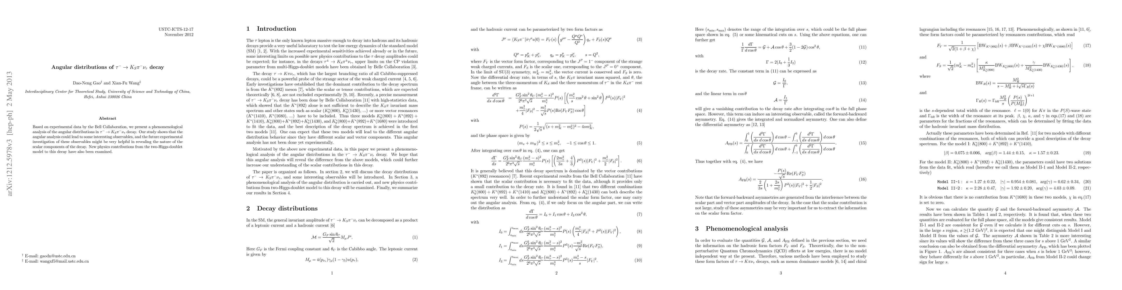 This paper analyzes the angular distributions in the tau- --> K_S pi-nu_tau decay using data from the Bell Collaboration, revealing potential observables that could elucidate the decay's scalar components. It also explores new physics contributions from the two-Higgs-doublet model.