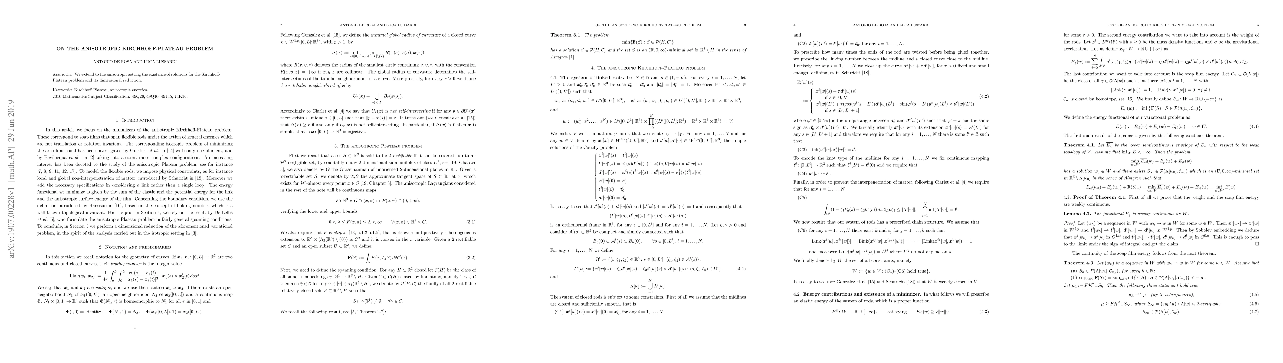 We extend to the anisotropic setting the existence of solutions for the Kirchhoff-Plateau problem and its dimensional reduction.