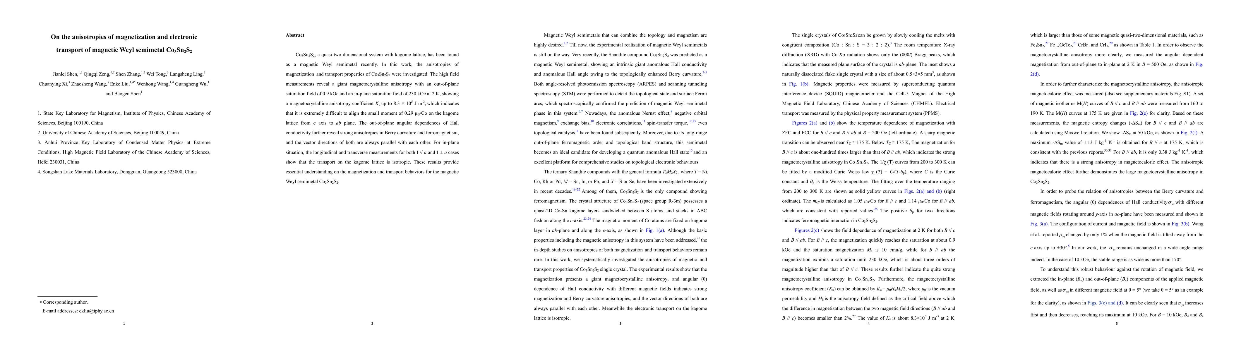 Co3Sn2S2, a magnetic Weyl semimetal with a kagome lattice, exhibits significant anisotropy in magnetization and electronic transport. High-field measurements reveal a giant magnetocrystalline anisotropy, with out-of-plane and in-plane saturation fields of 0.9 kOe and 230 kOe respectively, indicating strong anisotropy in Berry curvature and ferromagnetism.