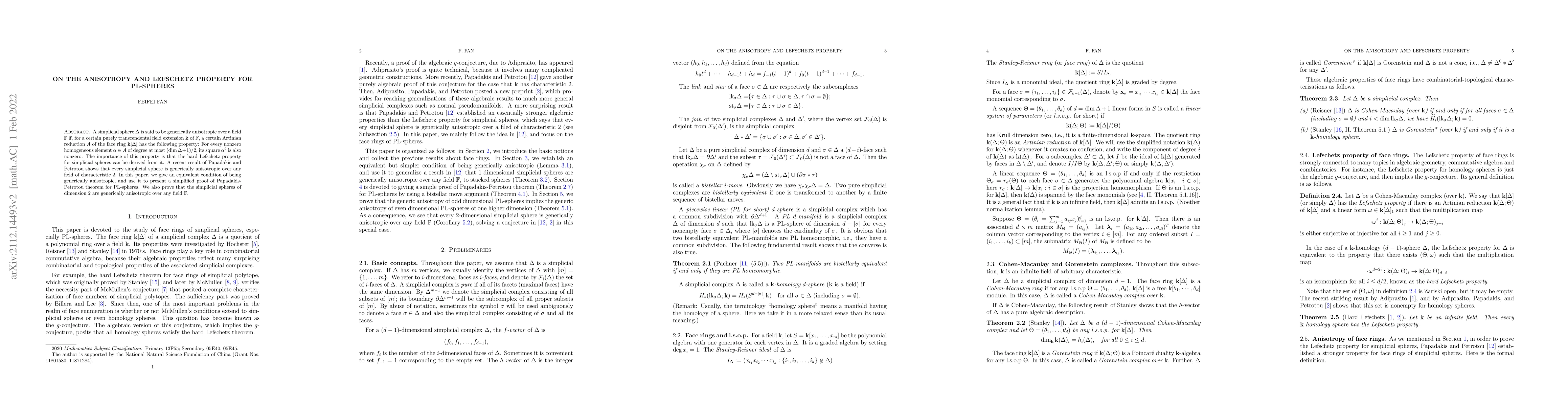 A simplicial sphere $\Delta$ is said to be generically anisotropic over a field $\mathbb{F}$ if, for a certain purely transcendental field extension $\mathbf{k}$ of $\mathbb{F}$, a certain Artinian reduction $A$ of the face ring $\mathbf{k}[\Delta]$ has the following property: For every nonzero homogeneous element $\alpha\in A$ of degree at most $(\dim\Delta+1)/2$, its square $\alpha^2$ is also nonzero. The importance of this property is that the hard Lefschetz property for simplicial spheres can be derived from it. A recent result of Papadakis and Petrotou shows that every simplicial sphere is generically anisotropic over any field of characteristic $2$. In this paper, we give an equivalent condition of being generically anisotropic, and use it to present a simplified proof of Papadakis-Petrotou theorem for PL-spheres. We also prove that the simplicial spheres of dimension $2$ are generically anisotropic over any field $\mathbb{F}$.