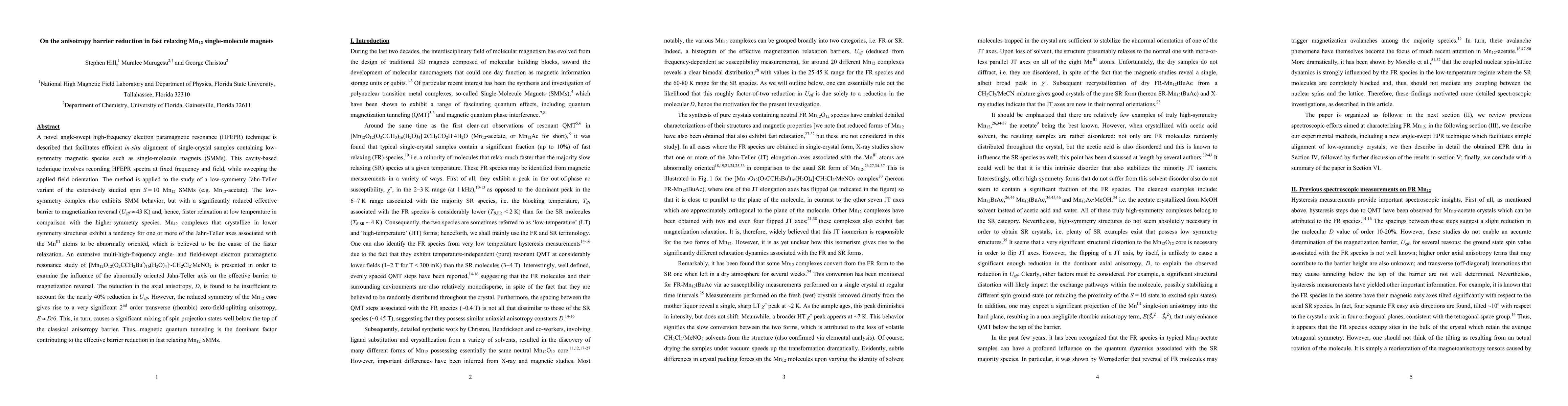 A novel angle-swept high-frequency EPR (HFEPR) technique is described that enables in-situ alignment of single-crystal samples containing low-symmetry magnetic species such as single-molecule magnets (SMMs). This cavity-based method involves recording spectra at fixed frequency and field, while sweeping the field orientation. The method is applied to the study of a low-symmetry Jahn-Teller variant of the spin S = 10 Mn12 SMMs (e.g. Mn12-acetate). The low-symmetry complex is also an SMM, but with a significantly reduced barrier to magnetization reversal (Ueff ~ 43 K) and, hence, faster relaxation at low temperature in comparison with the high-symmetry species. Mn12 complexes that crystallize in lower symmetry structures exhibit a tendency for one or more of the Mn(III) Jahn-Teller axes to be abnormally oriented, which is believed to be the cause of the faster relaxation. An extensive HFEPR study of [Mn12O12(O2CCH2But)16(H2O)4].CH2Cl2.MeNO2 is presented in order to examine the influence of the abnormally oriented Jahn-Teller axis on the effective barrier. The reduction in the axial anisotropy, D, is found to be insufficient to account for the nearly 40% reduction in Ueff. However, the reduced symmetry of the Mn12 core gives rise to a very significant 2nd order transverse anisotropy, E ~ D/6. This, in turn, causes a significant mixing of spin projection states well below the top of the classical barrier. Thus, magnetic quantum tunneling is the dominant factor contributing to the barrier reduction in fast relaxing Mn12 SMMs.