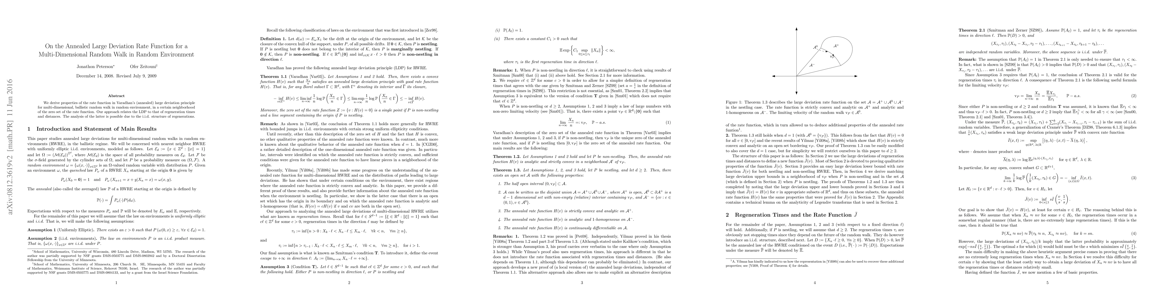 We derive properties of the rate function in Varadhan's (annealed) large deviation principle for multidimensional, ballistic random walk in random environment, in a certain neighborhood of the zero set of the rate function. Our approach relates the LDP to that of regeneration times and distances. The analysis of the latter is possible due to the i.i.d. structure of regenerations.