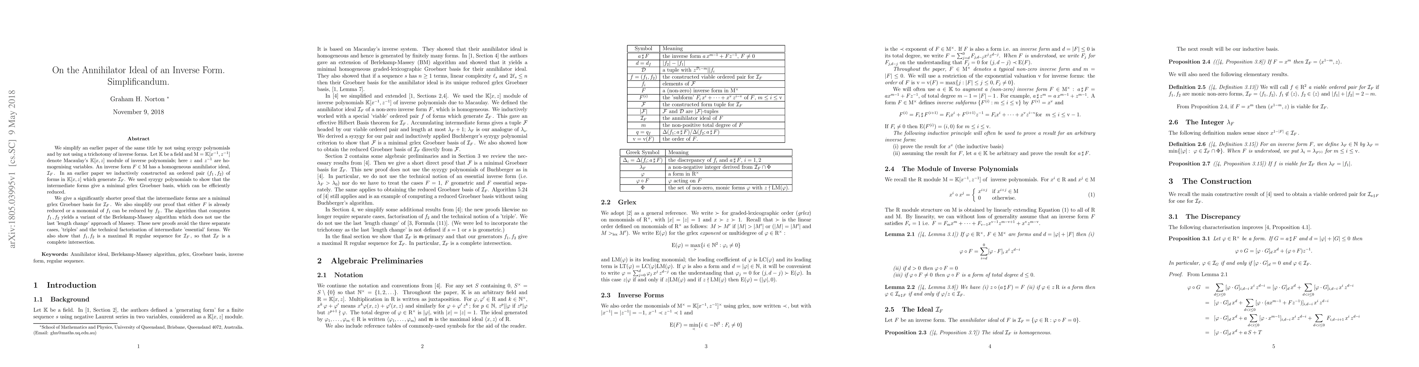 We simplify an earlier paper of the same title by not using syzygy polynomials and by not using a trichotomy of inverse forms. Let $\K$ be a field and $\M=\K[x^{-1},z^{-1}]$ denote Macaulay's $\K[x,z]$ module of inverse polynomials; here $z$ and $z^{-1}$ are homogenising variables. An inverse form $F\in\M$ has a homogeneous annihilator ideal, $\I_F$\,. In an earlier paper we inductively constructed an ordered pair ($f_1$\,,\,$f_2$) of forms in $\K[x,z]$ which generate $\I_F$. We used syzygy polynomials to show that the intermediate forms give a minimal grlex Groebner basis, which can be efficiently reduced. We give a significantly shorter proof that the intermediate forms are a minimal grlex Groebner basis for $\I_F$\,. We also simplify our proof that either $ F$ is already reduced or a monomial of $f_1$ can be reduced by $f_2$\,. The algorithm that computes $f_1\,,f_2$ yields a variant of the Berlekamp-Massey algorithm which does not use the last 'length change' approach of Massey. These new proofs avoid the three separate cases, 'triples' and the technical factorisation of intermediate 'essential' forms. We also show that $f_1,f_2$ is a maximal $\R$ regular sequence for $\I_F$\,, so that $\I_F$ is a complete intersection.