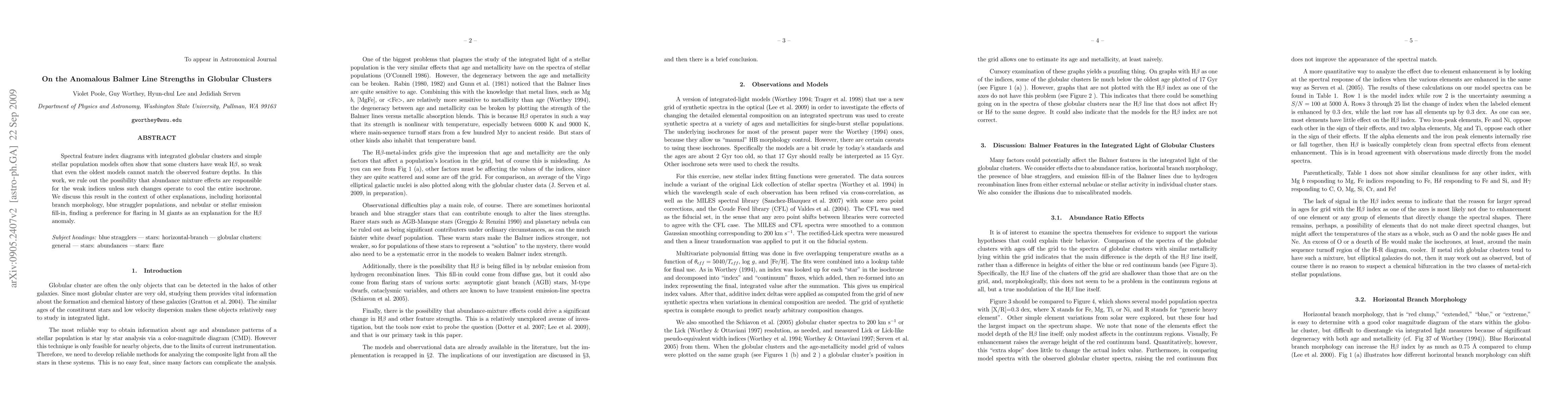 Spectral feature index diagrams with integrated globular clusters and simple stellar population models often show that some clusters have weak H beta, so weak that even the oldest models cannot match the observed feature depths. In this work, we rule out the possibility that abundance mixture effects are responsible for the weak indices unless such changes operate to cool the entire isochrone. We discuss this result in the context of other explanations, including horizontal branch morphology, blue straggler populations, and nebular or stellar emission fill-in, finding a preference for flaring in M giants as an explanation for the H beta anomaly.