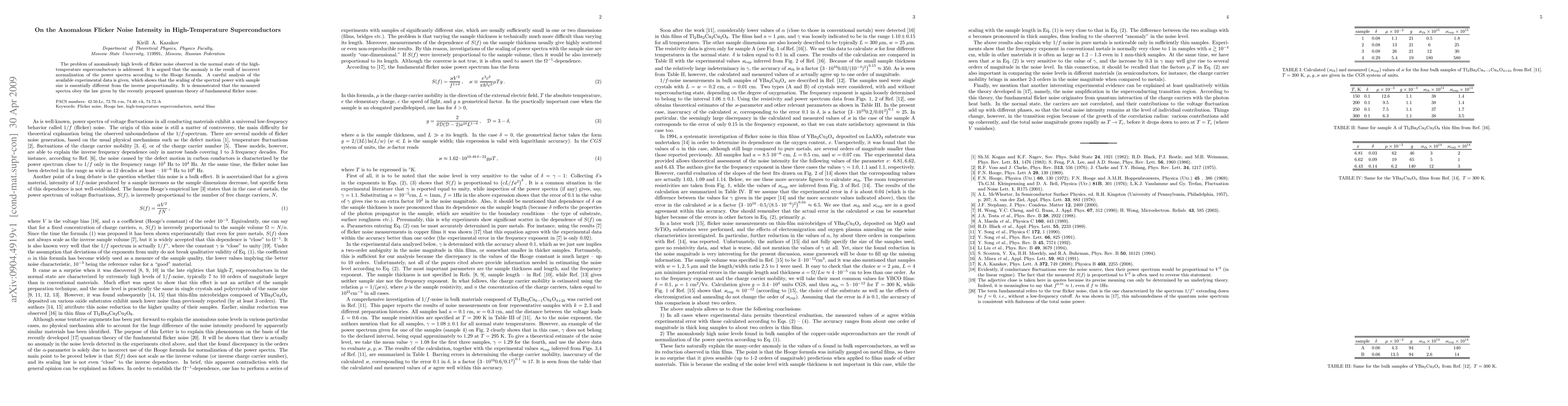 Summary: This paper investigates the unusually high flicker noise in high-temperature superconductors, attributing it to improper normalization using the Hooge formula. It presents a detailed analysis showing that the spectral power scales differently than expected, and aligns with a new quantum theory of fundamental flicker noise.