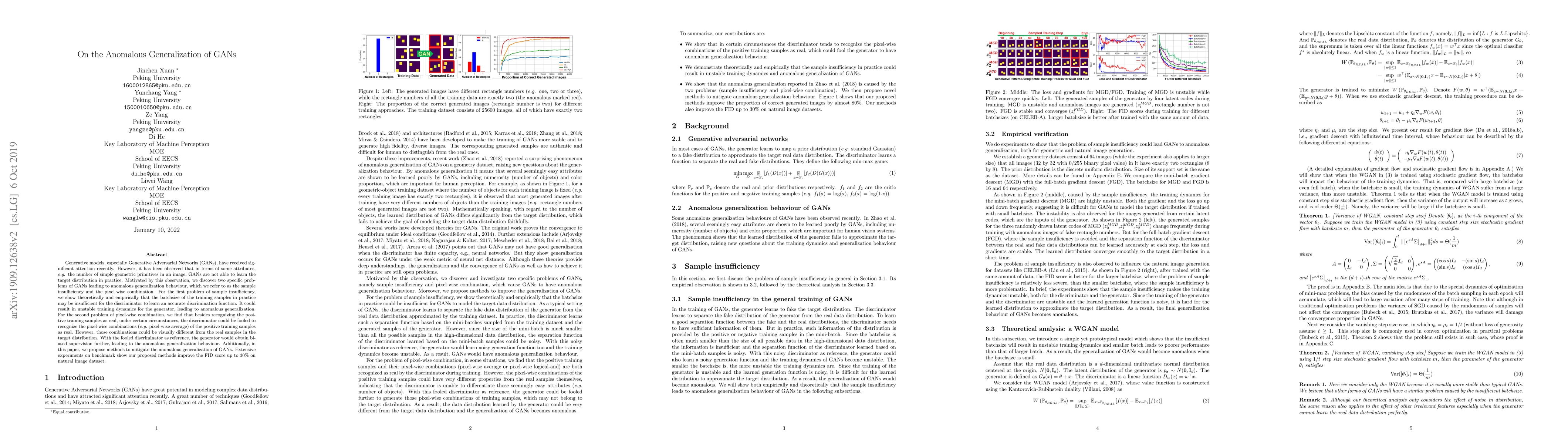 Generative models, especially Generative Adversarial Networks (GANs), have received significant attention recently. However, it has been observed that in terms of some attributes, e.g. the number of simple geometric primitives in an image, GANs are not able to learn the target distribution in practice. Motivated by this observation, we discover two specific problems of GANs leading to anomalous generalization behaviour, which we refer to as the sample insufficiency and the pixel-wise combination. For the first problem of sample insufficiency, we show theoretically and empirically that the batchsize of the training samples in practice may be insufficient for the discriminator to learn an accurate discrimination function. It could result in unstable training dynamics for the generator, leading to anomalous generalization. For the second problem of pixel-wise combination, we find that besides recognizing the positive training samples as real, under certain circumstances, the discriminator could be fooled to recognize the pixel-wise combinations (e.g. pixel-wise average) of the positive training samples as real. However, those combinations could be visually different from the real samples in the target distribution. With the fooled discriminator as reference, the generator would obtain biased supervision further, leading to the anomalous generalization behaviour. Additionally, in this paper, we propose methods to mitigate the anomalous generalization of GANs. Extensive experiments on benchmark show our proposed methods improve the FID score up to 30\% on natural image dataset.