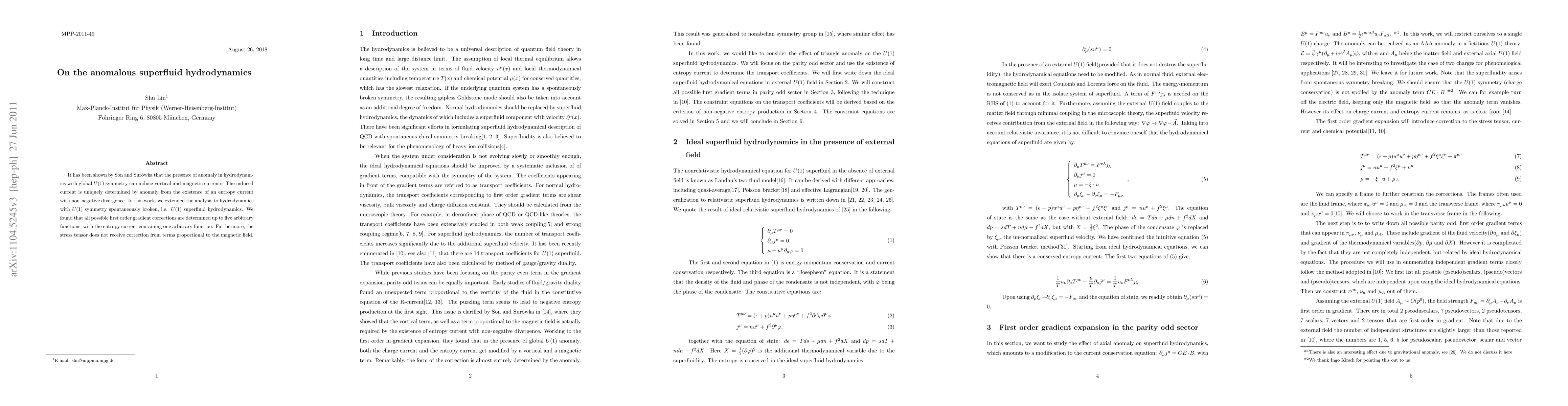 This paper extends the analysis of anomalous hydrodynamics to U(1) superfluid systems, revealing that first-order gradient corrections are determined by five arbitrary functions, with the entropy current containing one. Notably, the stress tensor remains unaffected by magnetic field-proportional terms.