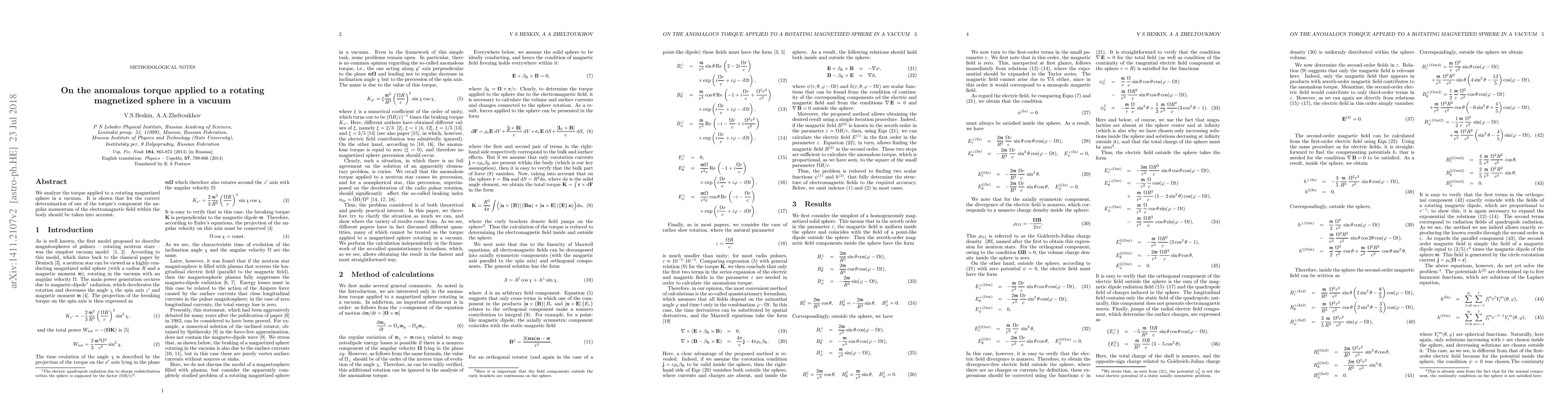 We analyze the torque applied to a rotating magnetized sphere in a vacuum. It is shown that for the correct determination of one of the torque's component the angular momentum of the electromagnetic field within the body should be taken into account.