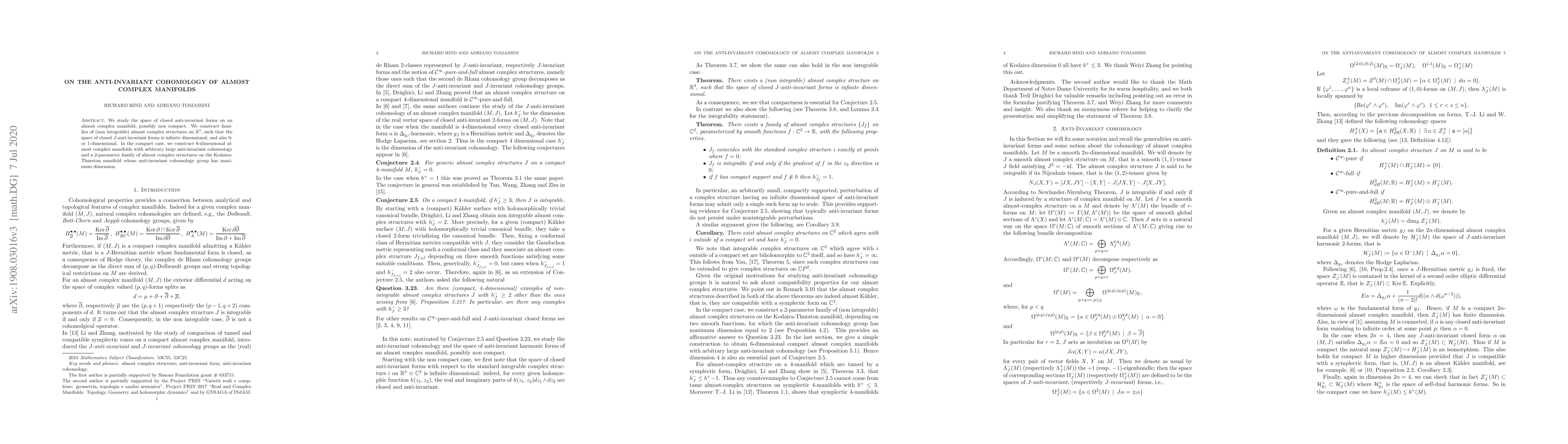 This paper investigates the anti-invariant cohomology on almost complex manifolds, demonstrating infinite, zero, or one-dimensional spaces of closed anti-invariant forms for non-integrable structures in $\R^4$. It also constructs compact almost complex manifolds with large anti-invariant cohomology and a two-parameter family on the Kodaira-Thurston manifold maximizing the anti-invariant cohomology dimension.
