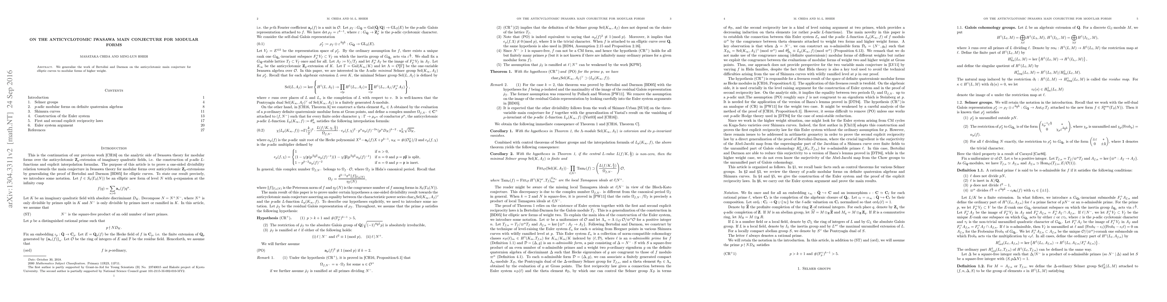 This paper extends the anticyclotomic main conjecture, originally developed by Bertolini and Darmon for weight two modular forms, to encompass higher weight modular forms, thus broadening the scope of the anticyclotomic Iwasawa theory.