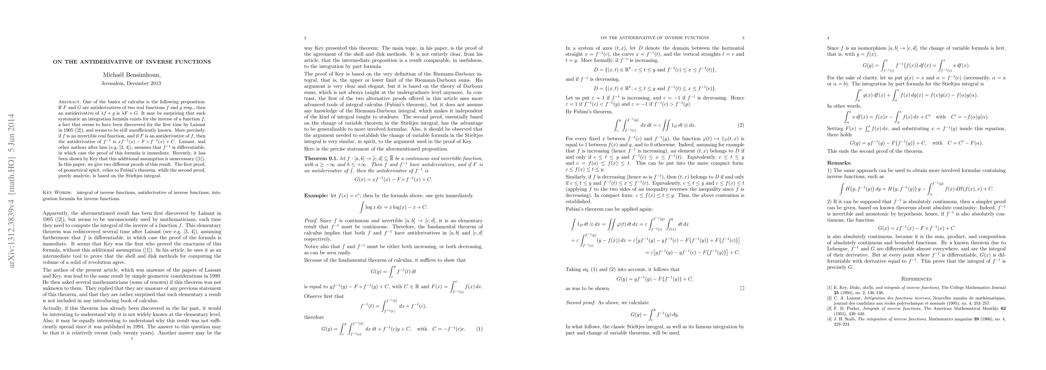 One of the basics of calculus is the following proposition: If $F$ and $G$ are antiderivatives of two real functions $f$ and $g$ resp., then an antiderivative of $\lambda f+g$ is $\lambda F + G$. It may be surprising that such systematic an integration formula exists for the inverse of a function $f$, a fact that seems to have been discovered for the first time by Laisant in 1905, and seems not to be well known. More precisely, if $f$ is an invertible real function, and if $F$ is an antiderivative of $f$, then the antiderivative of $f^{-1}$ is $xf^{-1}(x)-F\circ f^{-1}(x)+C$. Laisant, and other authors after him, assumes that $f^{-1}$ is differentiable, in which case the proof of this formula is immediate. Recently, it has been shown by Key that this additional assumption is unnecessary. In this paper, we give two different proofs of this result. The first proof, of geometrical spirit, relies to Fubini's theorem, while the second proof, purely analytic, is based on the Stieltjes integral.