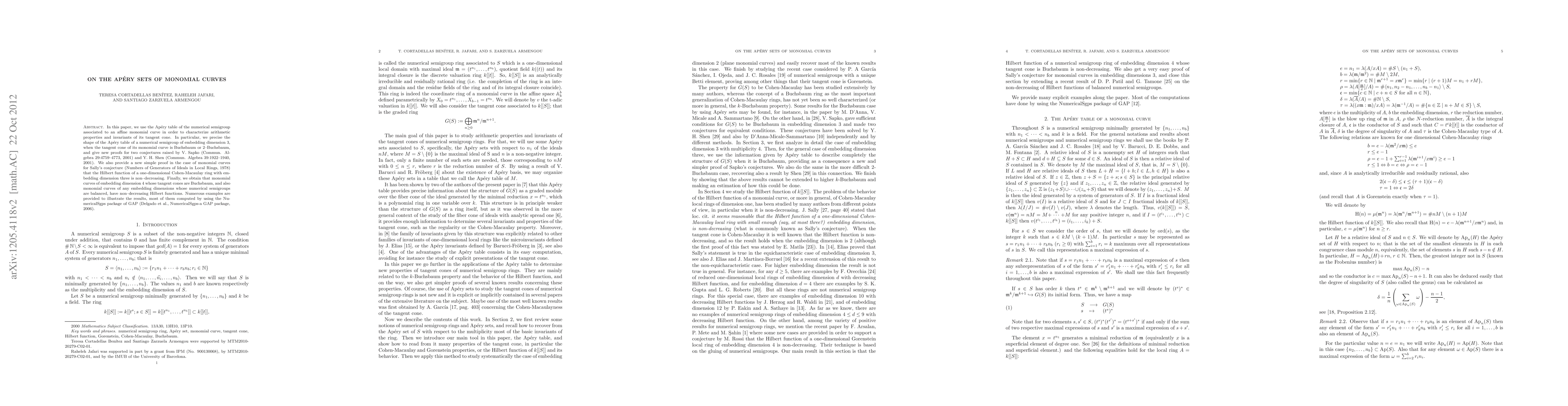 In this paper, we use the Ap\'ery table of the numerical semigroup associated to an affine monomial curve in order to characterize arithmetic properties and invariants of its tangent cone. In particular, we precise the shape of the Ap\'ery table of a numerical semigroup of embedding dimension 3, when the tangent cone of its monomial curve is Buchsbaum or 2-Buchsbaum, and give new proofs for two conjectures raised by V. Sapko (Commun. Algebra {29}:4759-4773, 2001) and Y. H. Shen (Commun. Algebra {39}:1922-1940, 2001). We also provide a new simple proof in the case of monomial curves for Sally's conjecture (Numbers of Generators of Ideals in Local Rings, 1978) that the Hilbert function of a one-dimensional Cohen-Macaulay ring with embedding dimension three is non-decreasing. Finally, we obtain that monomial curves of embedding dimension 4 whose tangent cones are Buchsbaum, and also monomial curves of any embedding dimensions whose numerical semigroups are balanced, have non-decreasing Hilbert functions. Numerous examples are provided to illustrate the results, most of them computed by using the NumericalSgps package of GAP (Delgado et al., NumericalSgps-a GAP package, 2006).