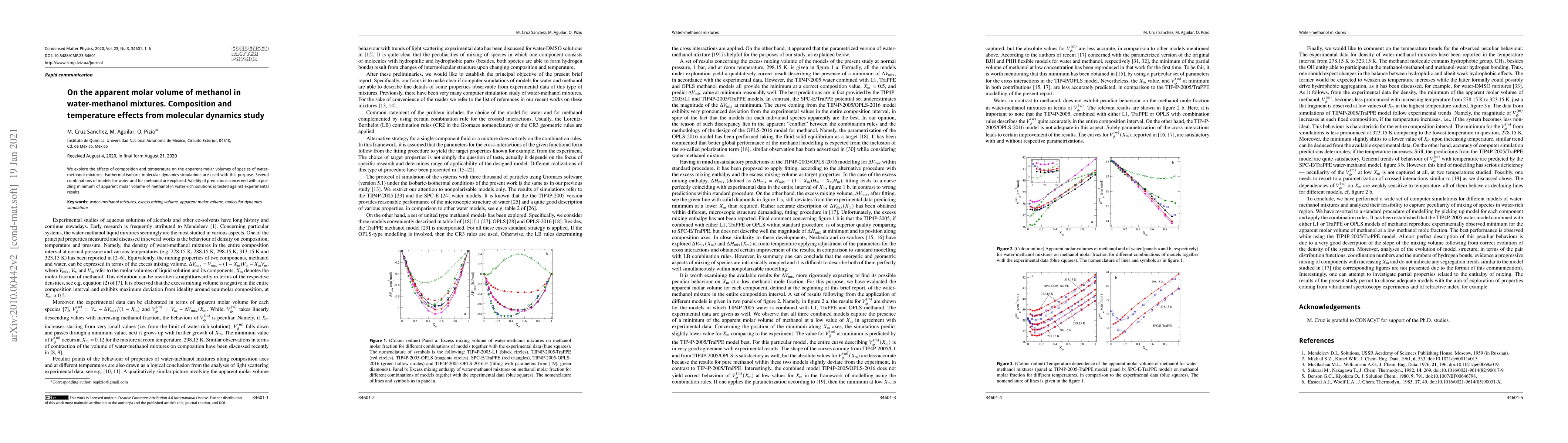 This study uses isothermal-isobaric molecular dynamics simulations to investigate the effects of composition and temperature on the apparent molar volumes of water-methanol mixtures. The research tests the validity of predictions regarding the minimum apparent molar volume of methanol in water-rich solutions against experimental data.