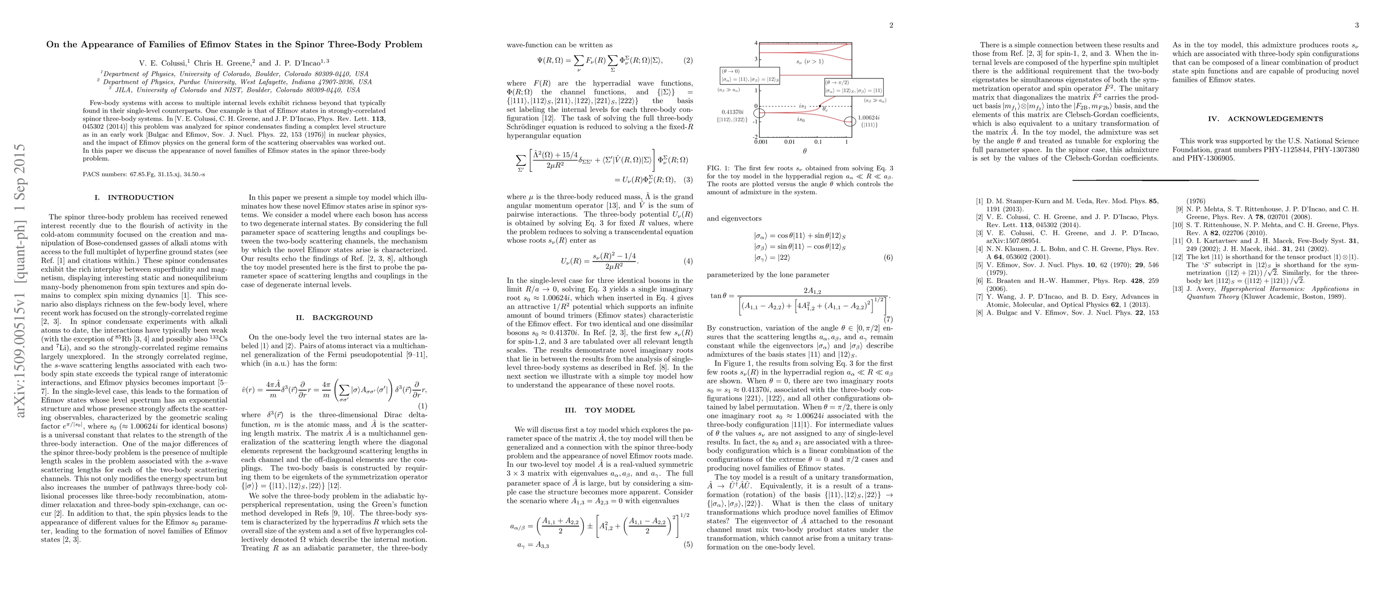 Few-body systems with access to multiple internal levels exhibit richness beyond that typically found in their single-level counterparts. One example is that of Efimov states in strongly-correlated spinor three-body systems. In [V. E. Colussi, C. H. Greene, and J. P. D'Incao, Phys. Rev. Lett. {\bf 113}, 045302 (2014)] this problem was analyzed for spinor condensates finding a complex level structure as in an early work [Bulgac and Efimov, Sov. J. Nucl. Phys. 22, 153 (1976)] in nuclear physics, and the impact of Efimov physics on the general form of the scattering observables was worked out. In this paper we discuss the appearance of novel families of Efimov states in the spinor three-body problem.