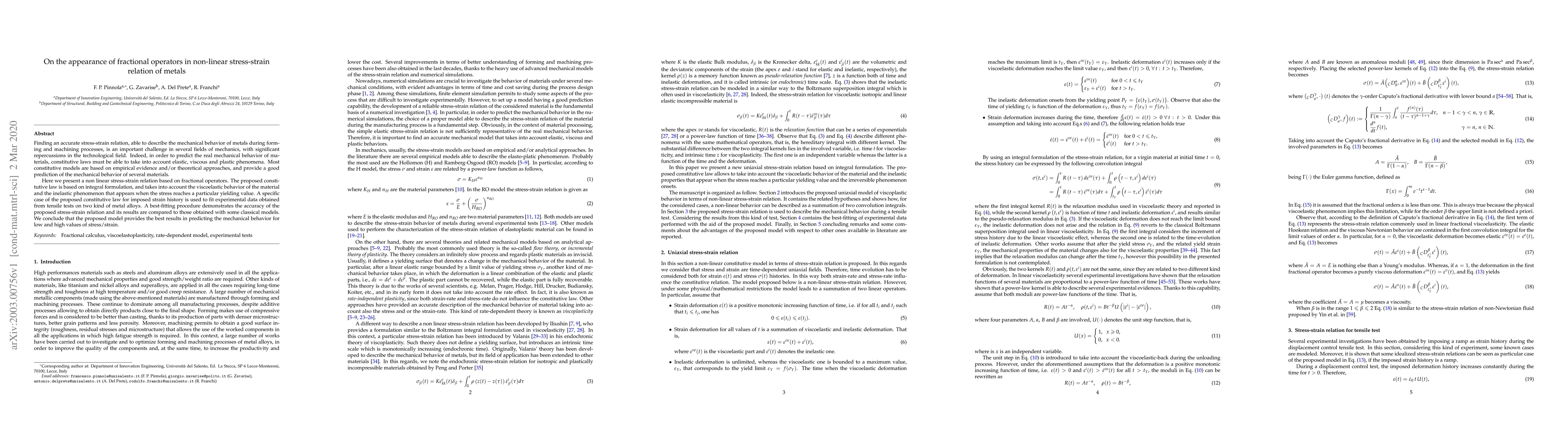 This paper proposes a non-linear stress-strain relation for metals using fractional operators to account for viscoelastic and plastic behavior during forming and machining processes. The model fits experimental data from tensile tests on metal alloys, showing improved accuracy compared to classical models.
