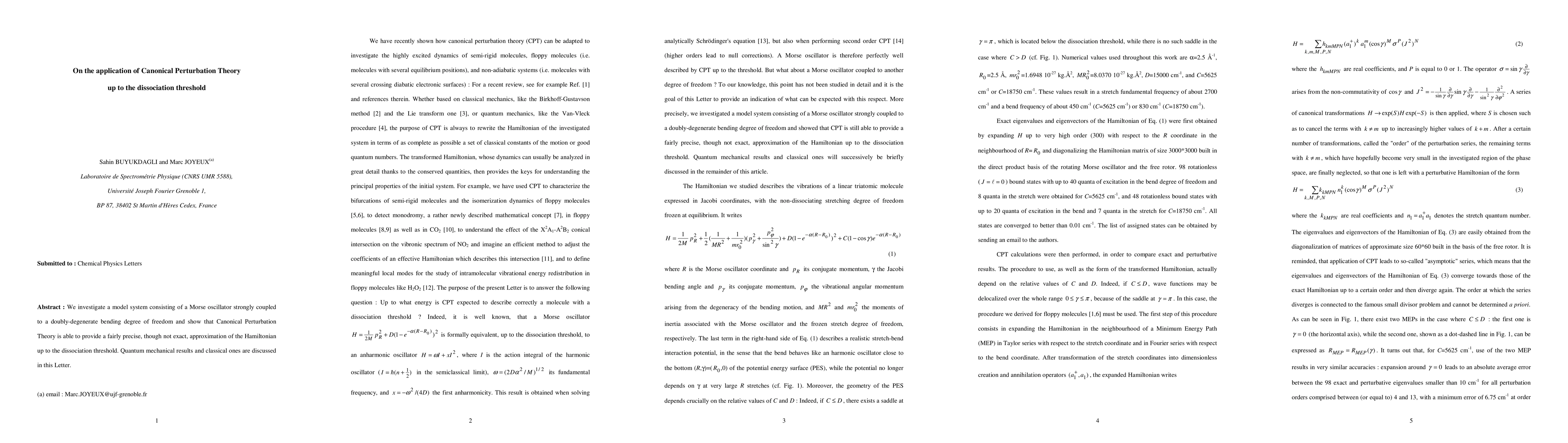 We investigate a model system consisting of a Morse oscillator strongly coupled to a doubly-degenerate bending degree of freedom and show that Canonical Perturbation Theory is able to provide a fairly precise, though not exact, approximation of the Hamiltonian up to the dissociation threshold. Quantum mechanical results and classical ones are discussed in this Letter.