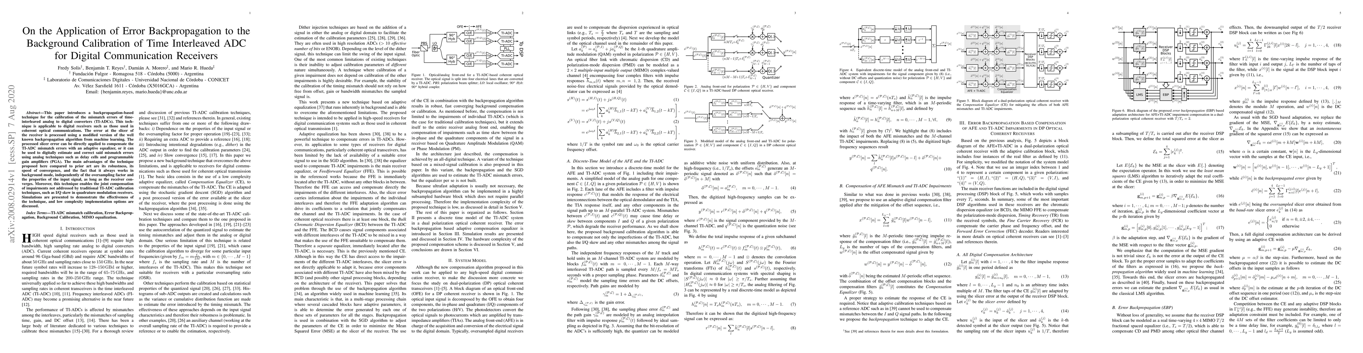 This paper proposes a backpropagation-based method for calibrating mismatch errors in time-interleaved ADCs used in digital communication receivers, demonstrating robustness and speed of convergence, and enabling joint compensation of additional impairments like I/Q skew. Simulation results validate the technique's effectiveness.