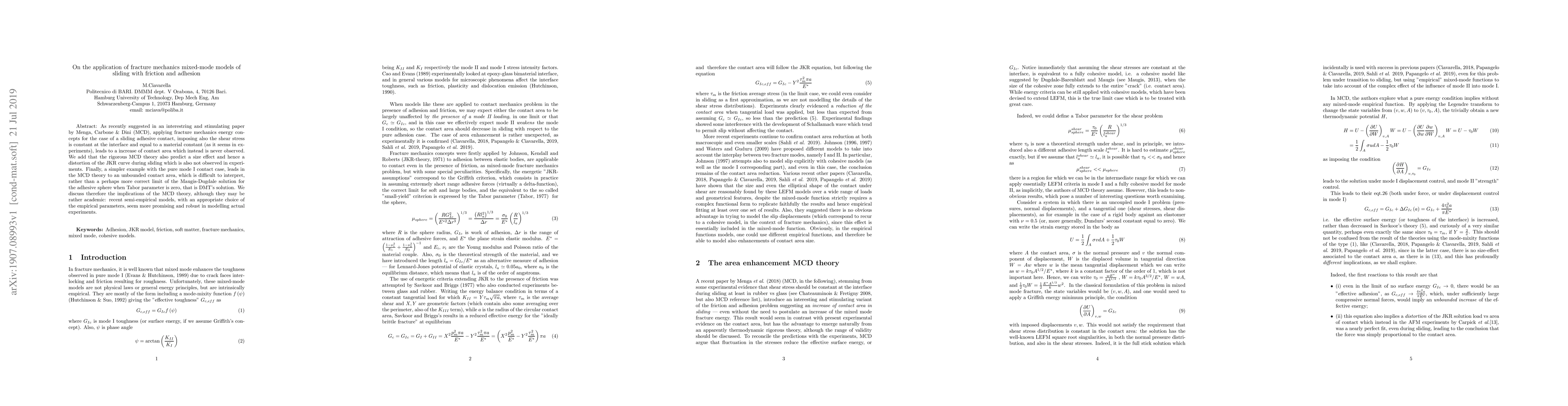 As recently suggested in an interestring and stimulating paper by Menga, Carbone & Dini (MCD), applying fracture mechanics energy concepts for the case of a sliding adhesive contact, imposing also the shear stress is constant at the interface and equal to a material constant (as it seems in experiments), leads to a increase of contact area which instead is never observed. We add that the rigorous MCD theory also predict a size effect and hence a distortion of the JKR curve during sliding which is also not observed in experiments. Finally, a simpler example with the pure mode I contact case, leads in the MCD theory to an unbounded contact area, which is difficult to interpret, rather than a perhaps more correct limit of the Maugis-Dugdale solution for the adhesive sphere when Tabor parameter is zero, that is DMT's solution. We discuss therefore the implications of the MCD theory, although they may be rather academic: recent semi-empirical models, with an appropriate choice of the empirical parameters, seem more promising and robust in modelling actual experiments.