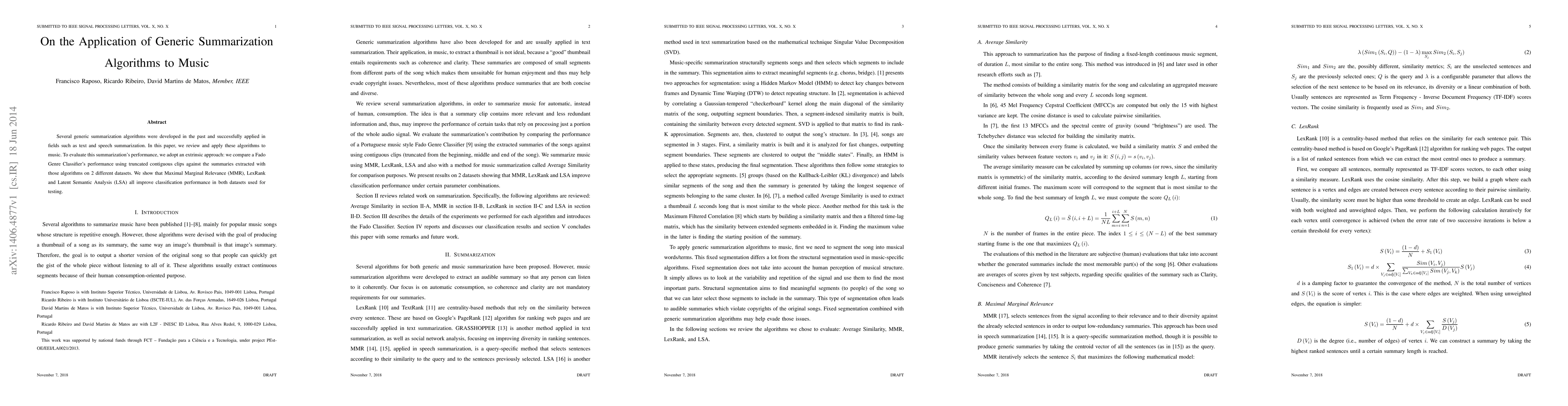 Several generic summarization algorithms were developed in the past and successfully applied in fields such as text and speech summarization. In this paper, we review and apply these algorithms to music. To evaluate this summarization's performance, we adopt an extrinsic approach: we compare a Fado Genre Classifier's performance using truncated contiguous clips against the summaries extracted with those algorithms on 2 different datasets. We show that Maximal Marginal Relevance (MMR), LexRank and Latent Semantic Analysis (LSA) all improve classification performance in both datasets used for testing.