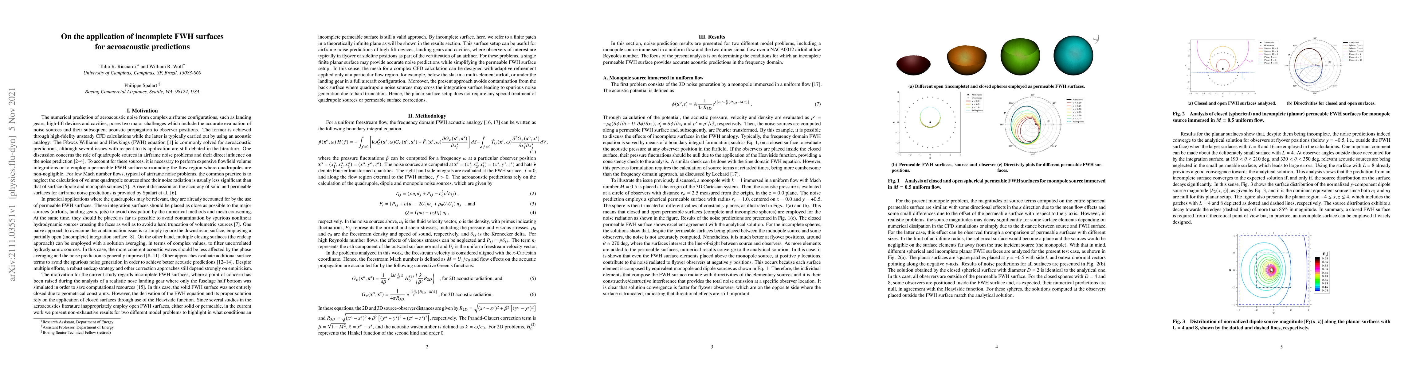 This work is motivated by CFD simulations from a realistic landing gear performed modeling only the half bottom of the aircraft fuselage [15]. Hence, in this previous analysis, the aeroacoustic predictions had to employ incomplete FWH surfaces. In the present study, a discussion on the closed surface requirement is provided for the frequency domain FWH formulation, although we believe that the approach presented here can also be applied for the time-domain methodology. We show that all sources computed on the closed permeable surface may play an important role if the acoustic prediction is sought at observer positions distributed along the entire circular arc. However, results obtained for 2D and 3D model problems show that, if wisely designed, a permeable FWH surface composed only by a finite patch, i.e., an incomplete surface, can be employed to accurately predict the noise at specific observer positions. In this case, the surface must be placed between the line of sight from the sources to the observers, for example, in flyover or sideline locations. In the current applications, results from finite surfaces agree with the expected values as long as the source magnitudes decay on elements distant from the true incident source, i.e., the airframe. Hence, in order for this approach to be valid, the sources cannot be truncated. The planar setup is beneficial in airframe noise applications since it avoids contamination by quadrupole sources crossing the boundaries and also may simplify the surface design.