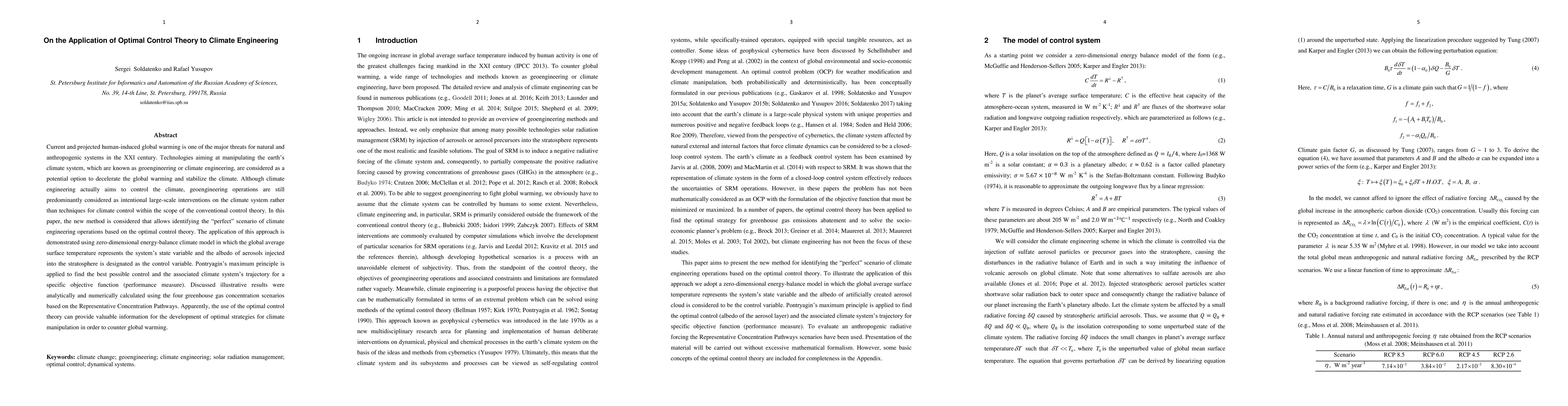 The new method is considered for identifying the perfect (optimal) scenario of climate engineering operations based on the optimal control theory. The application of this approach is demonstrated using zero-dimensional energy-balance climate model. The global average surface temperature represents the state variable and the reflective power of aerosols injected into the stratosphere is designated as the control variable. Maximum principle is used to find the best possible control and the associated climate system trajectory for a specific objective function (performance measure). Discussed illustrative results were analytically and numerically calculated using the four greenhouse gas concentration scenarios based on the Representative Concentration Pathways.