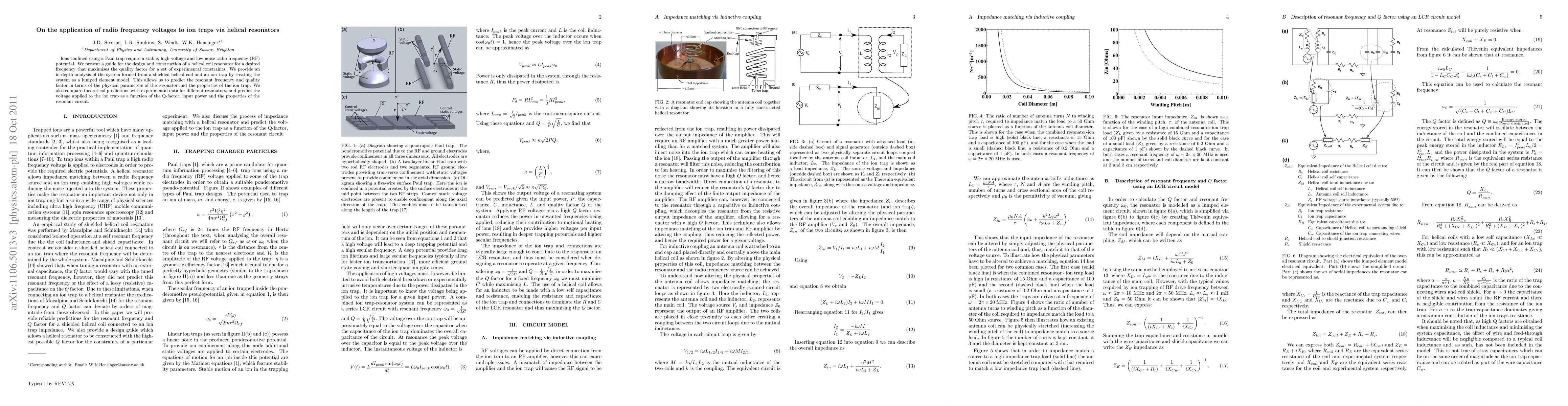 Ions confined using a Paul trap require a stable, high voltage and low noise radio frequency (RF) potential. We present a guide for the design and construction of a helical coil resonator for a desired frequency that maximises the quality factor for a set of experimental constraints. We provide an in-depth analysis of the system formed from a shielded helical coil and an ion trap by treating the system as a lumped element model. This allows us to predict the resonant frequency and quality factor in terms of the physical parameters of the resonator and the properties of the ion trap. We also compare theoretical predictions with experimental data for different resonators, and predict the voltage applied to the ion trap as a function of the Q-factor, input power and the properties of the resonant circuit.