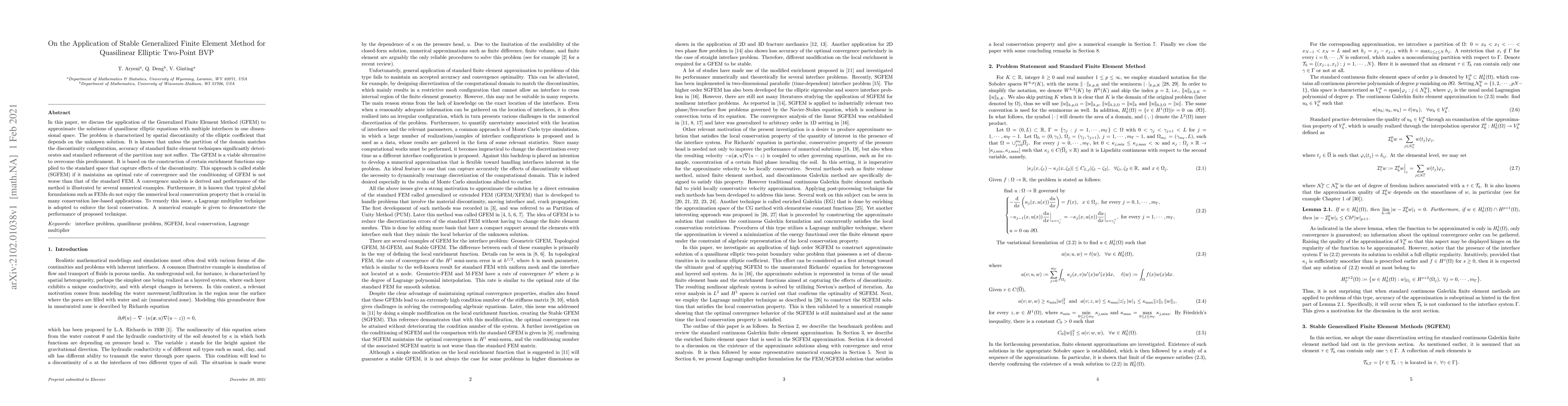 In this paper, we discuss the application of the Generalized Finite Element Method (GFEM) to approximate the solutions of quasilinear elliptic equations with multiple interfaces in one dimensional space. The problem is characterized by spatial discontinuity of the elliptic coefficient that depends on the unknown solution. It is known that unless the partition of the domain matches the discontinuity configuration, accuracy of standard finite element techniques significantly deteriorates and standard refinement of the partition may not suffice. The GFEM is a viable alternative to overcome this predicament. It is based on the construction of certain enrichment functions supplied to the standard space that capture effects of the discontinuity. This approach is called stable (SGFEM) if it maintains an optimal rate of convergence and the conditioning of GFEM is not worse than that of the standard FEM. A convergence analysis is derived and performance of the method is illustrated by several numerical examples. Furthermore, it is known that typical global formulations such as FEMs do not enjoy the numerical local conservation property that is crucial in many conservation law-based applications. To remedy this issue, a Lagrange multiplier technique is adopted to enforce the local conservation. A numerical example is given to demonstrate the performance of proposed technique.