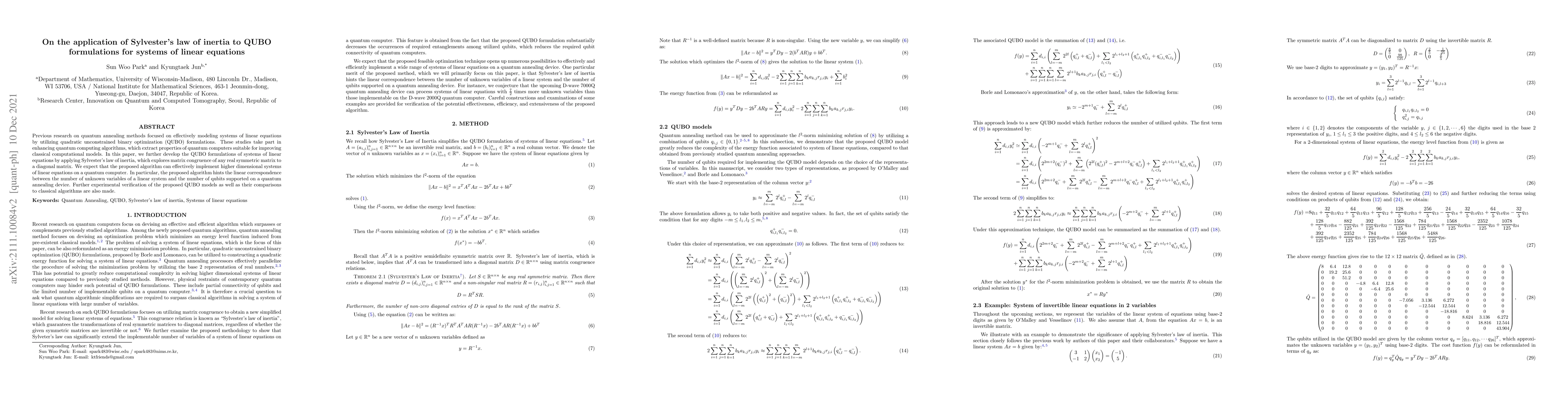 Previous research on quantum annealing methods focused on effectively modeling systems of linear equations by utilizing quadratic unconstrained binary optimization (QUBO) formulations. These studies take part in enhancing quantum computing algorithms, which extract properties of quantum computers suitable for improving classical computational models. In this paper, we further develop the QUBO formulations of systems of linear equations by applying Sylvester's law of inertia, which explores matrix congruence of any real symmetric matrix to a diagonal matrix. We expect that the proposed algorithm can effectively implement higher dimensional systems of linear equations on a quantum computer. Further experimental verification of the proposed QUBO models as well as their comparisons to classical algorithms are also made.