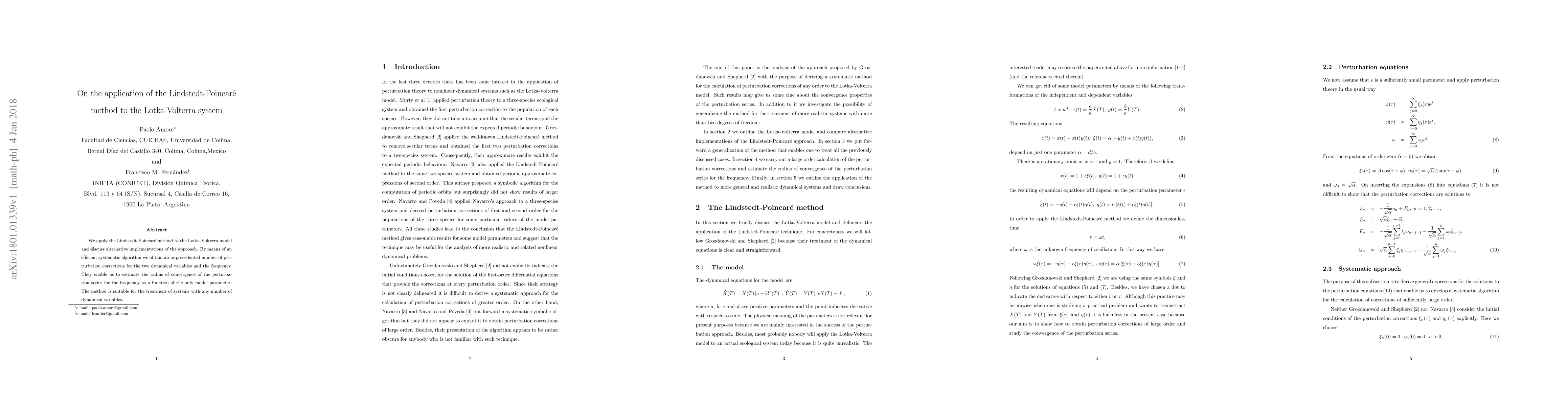 The paper applies the Lindstedt-Poincaré method to the Lotka-Volterra model, achieving numerous perturbation corrections for its dynamical variables and frequency. This approach enables estimation of the perturbation series' convergence radius, demonstrating the method's applicability to systems with multiple dynamical variables.