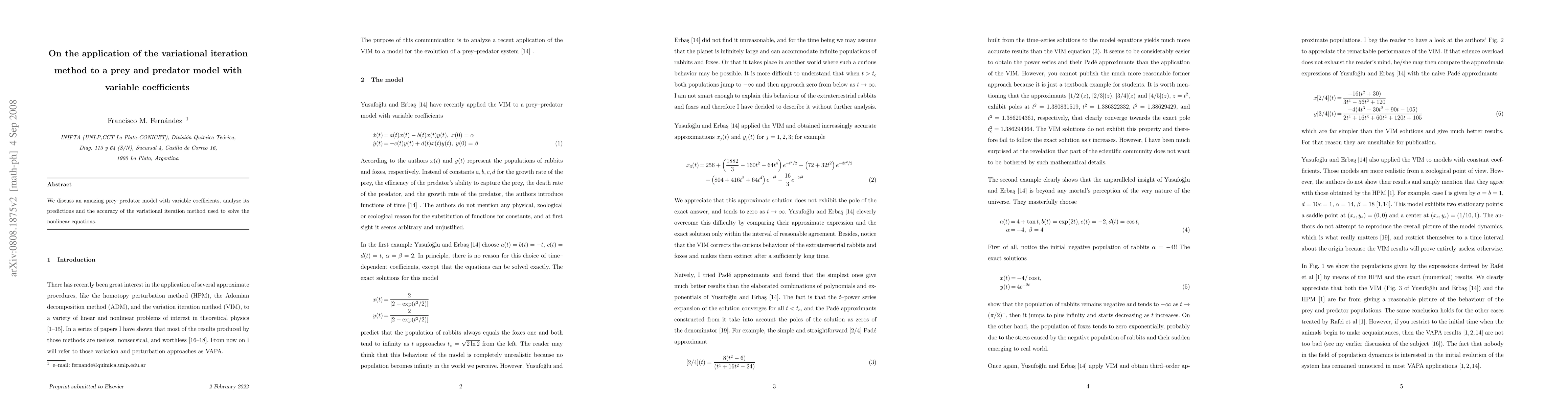 Summary: This paper explores a prey-predator model with variable coefficients and evaluates the effectiveness of the variational iteration method in solving its nonlinear equations, highlighting the model's predictions and the accuracy of the applied numerical technique.