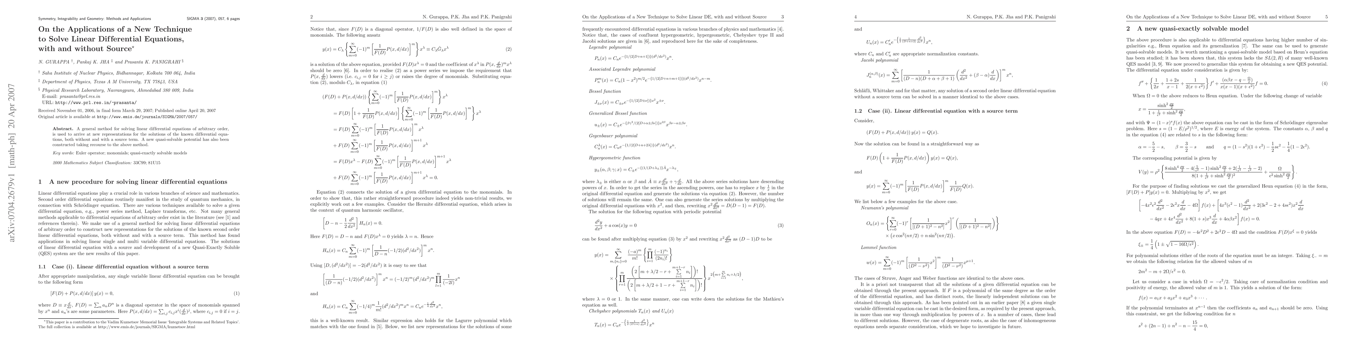A general method for solving linear differential equations of arbitrary order, is used to arrive at new representations for the solutions of the known differential equations, both without and with a source term. A new quasi-solvable potential has also been constructed taking recourse to the above method.