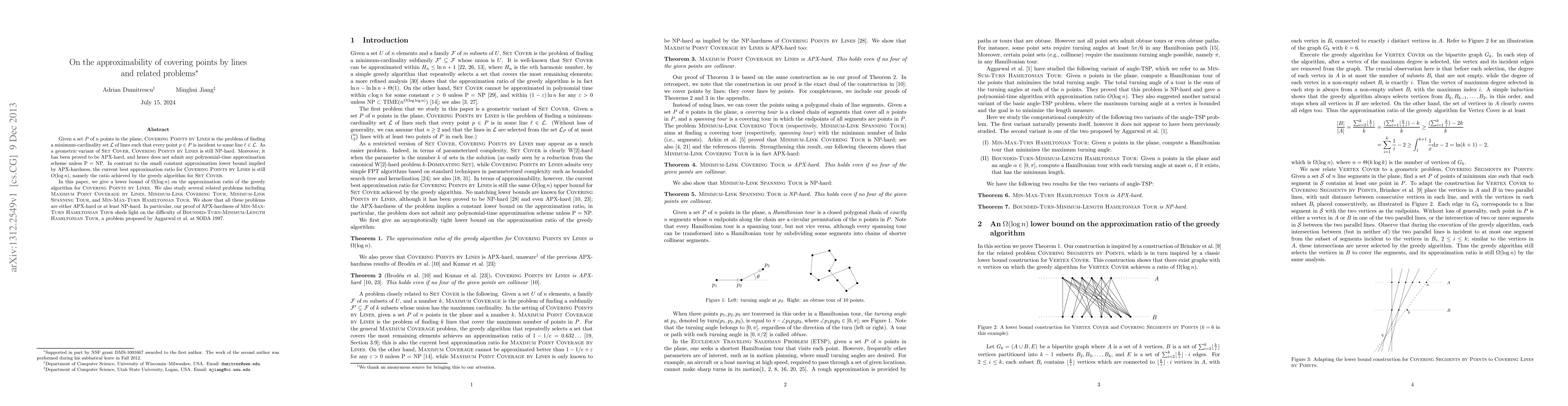 This paper investigates the approximability of the "Covering Points by Lines" problem and related geometric variants, proving that the greedy algorithm achieves a lower bound of $\Omega(\log n)$ for this problem. It also demonstrates that several related problems, including "Maximum Point Coverage by Lines" and "Min-Max-Turn Hamiltonian Tour," are either APX-hard or NP-hard.