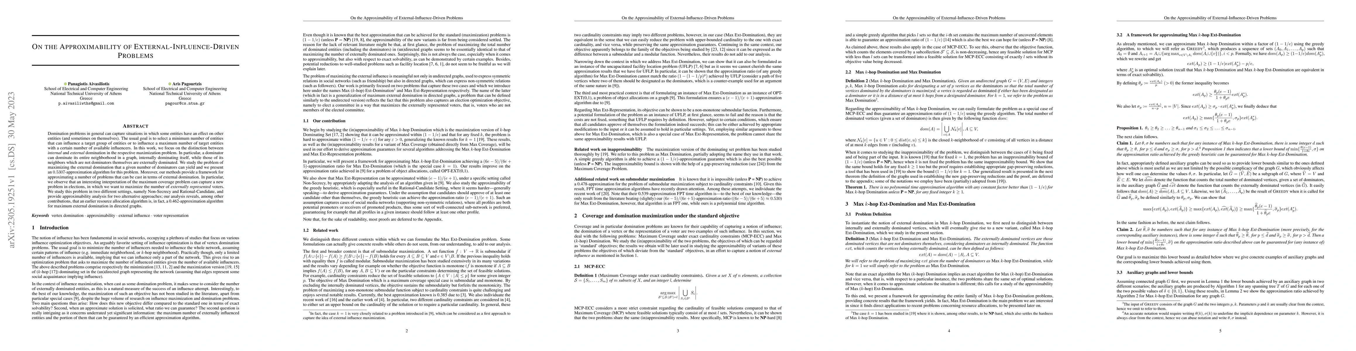 This paper explores the approximability of external-influence-driven problems, specifically focusing on external domination in graphs. It presents a 0.5307-approximation algorithm for maximizing external domination and extends the framework to analyze election-related problems, revealing that an earlier algorithm is also a 0.462-approximation for maximum external domination in directed graphs.