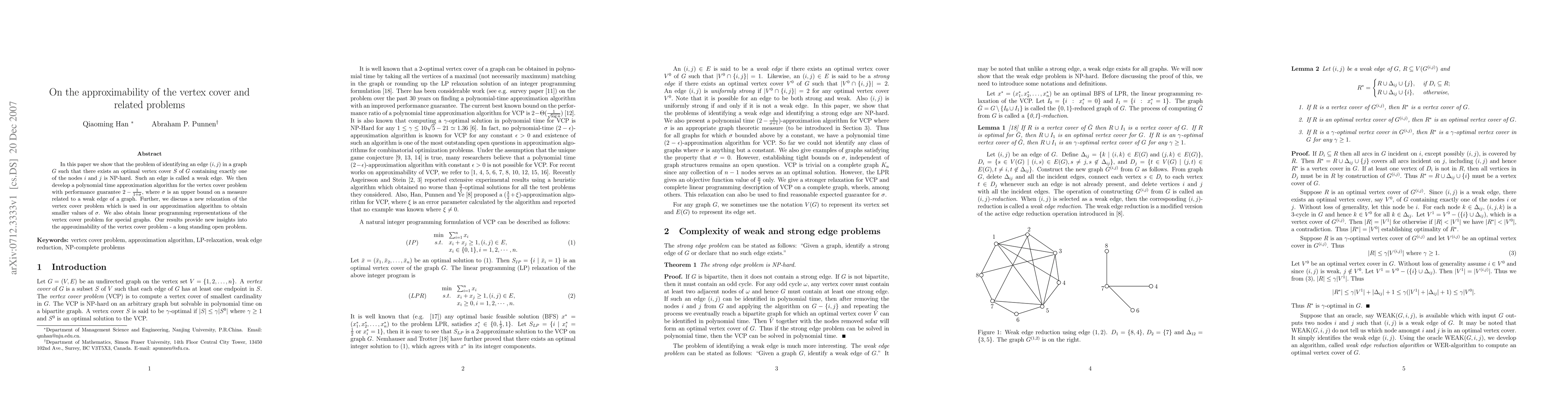 This paper demonstrates the NP-hardness of identifying weak edges in a graph and presents a polynomial time approximation algorithm for the vertex cover problem with a performance guarantee of $2-\frac{1}{1+\sigma}$. It introduces a new relaxation technique and linear programming representations for special graphs, offering new insights into the long-standing open problem of vertex cover approximability.