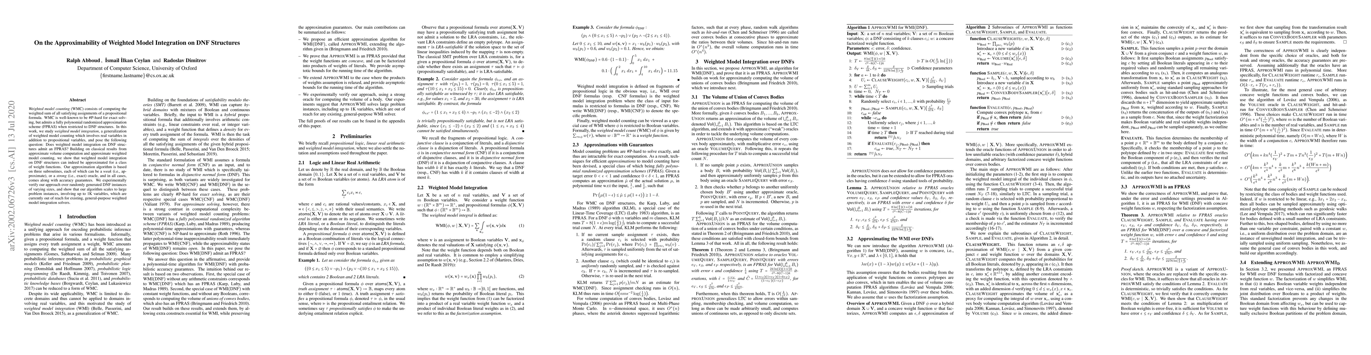 This paper investigates the approximability of weighted model integration on DNF structures, showing that it can be approximated for certain weight functions using a three-subroutine algorithm. The approach scales to large instances, outperforming existing solvers.